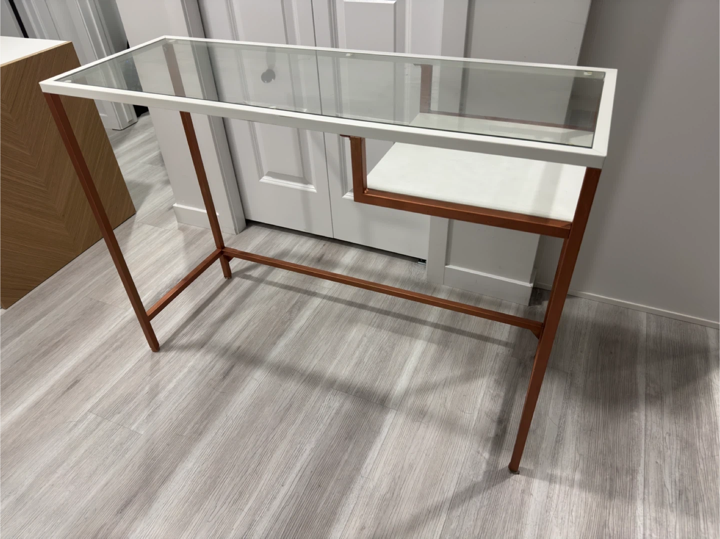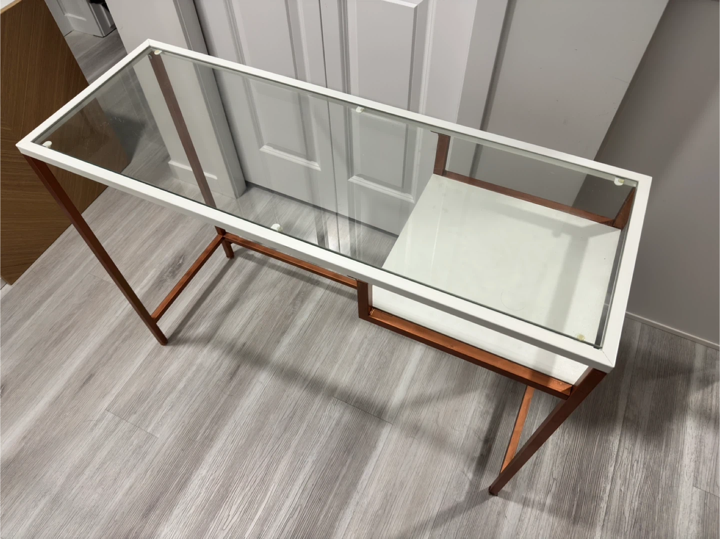 Looking to add a touch of modern elegance to your entryway or living space? This console table features a sleek glass top and a unique design with a shelf. The frame appears to be a sturdy metal, possibly copper coloured, offering a stylish contrast to the clear glass. It's in great shape and ready for a new home!