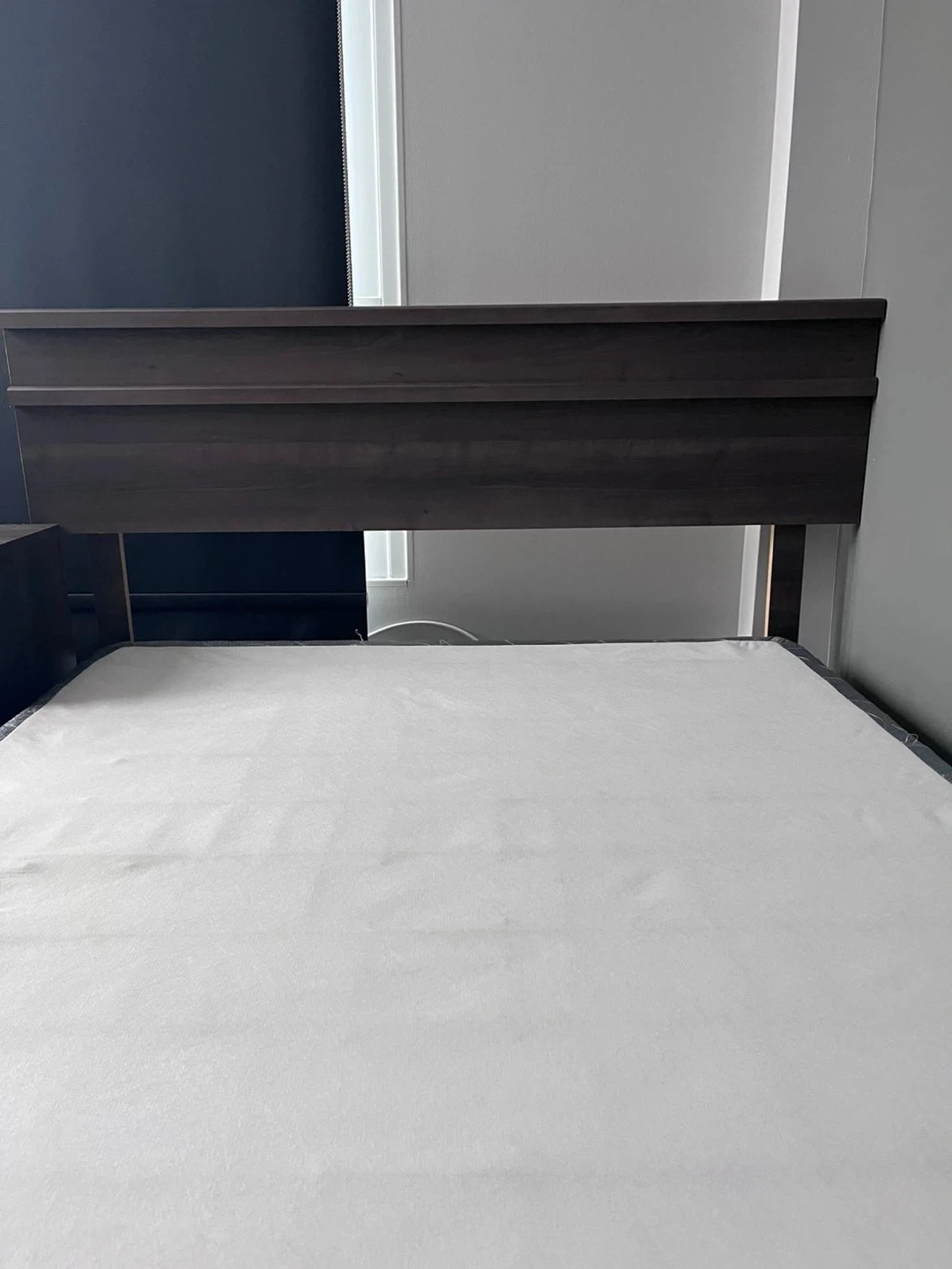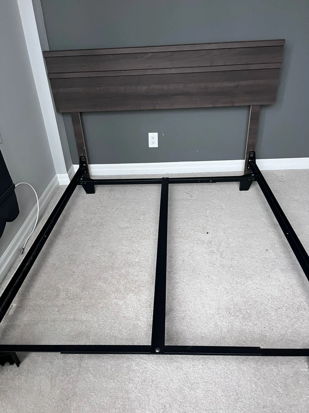 Stylish headboard in a dark wood finish with horizontal slat detailing. Sturdy black metal bed frame and box spring( like new ) . Everything in excellent condition. Need gone by weekend