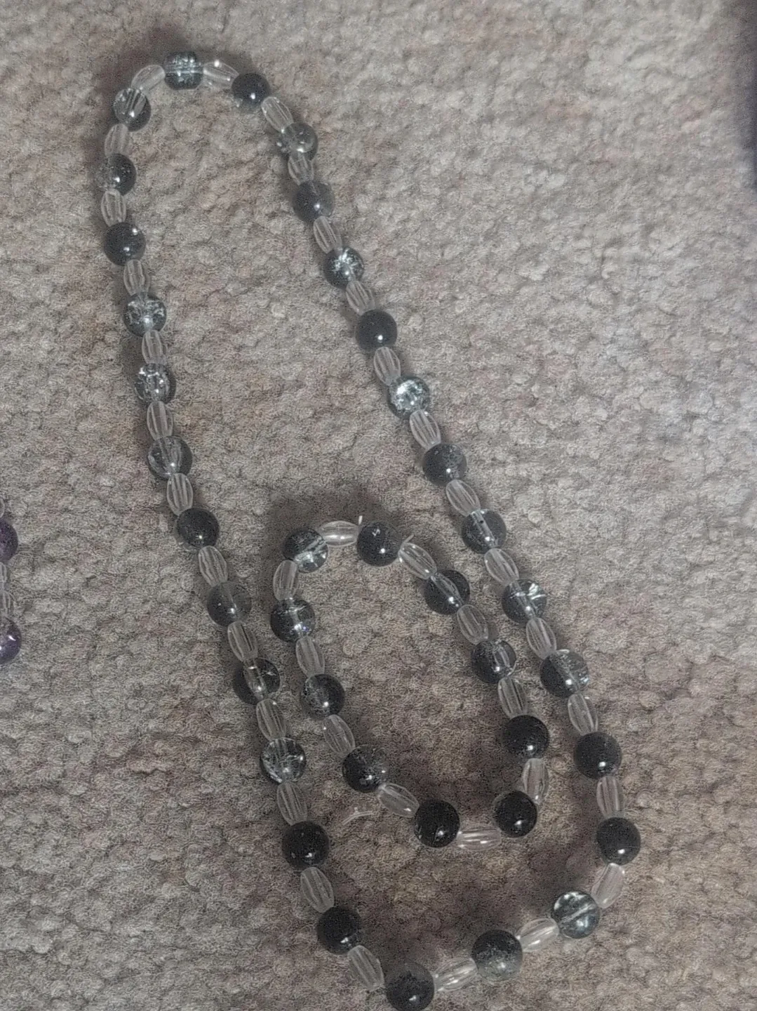 A set of handmade beaded jewellery. The necklace and bracelet feature black and clear faceted beads. They're strung together on durable cord.