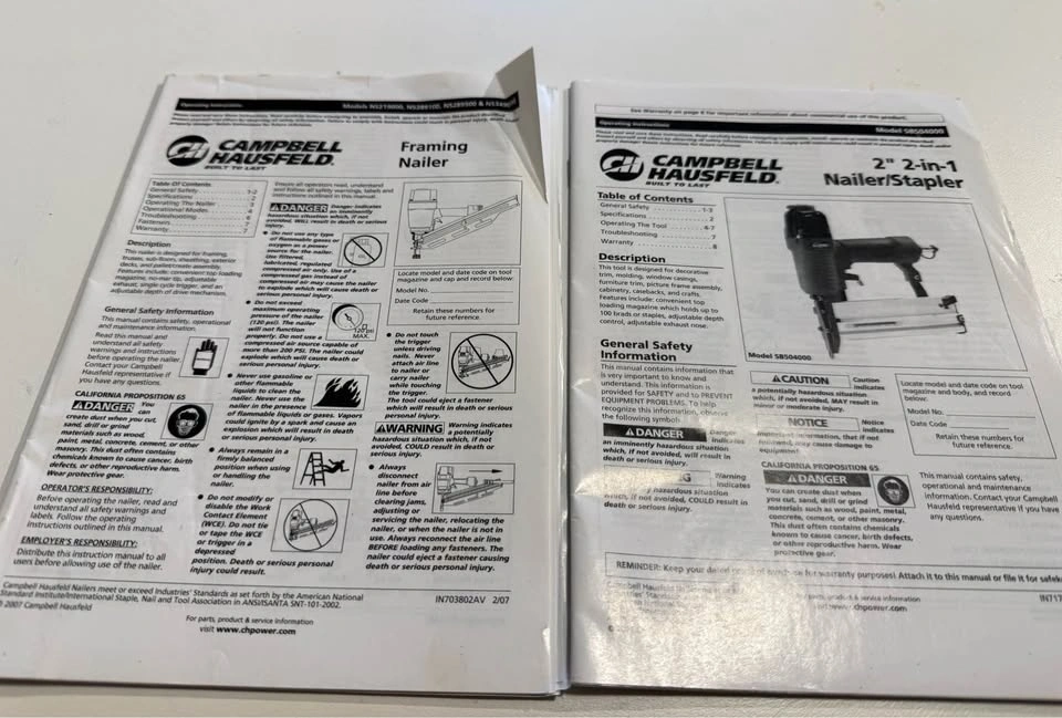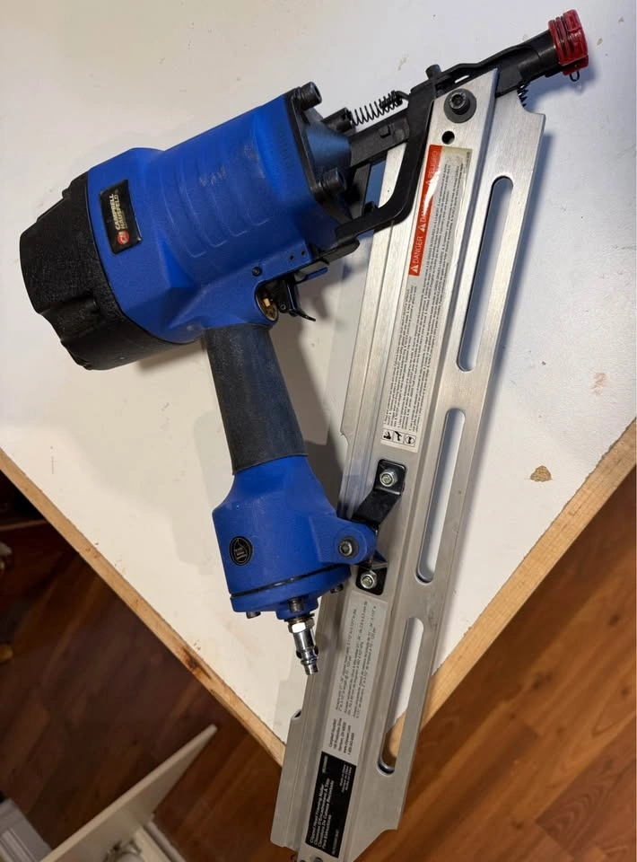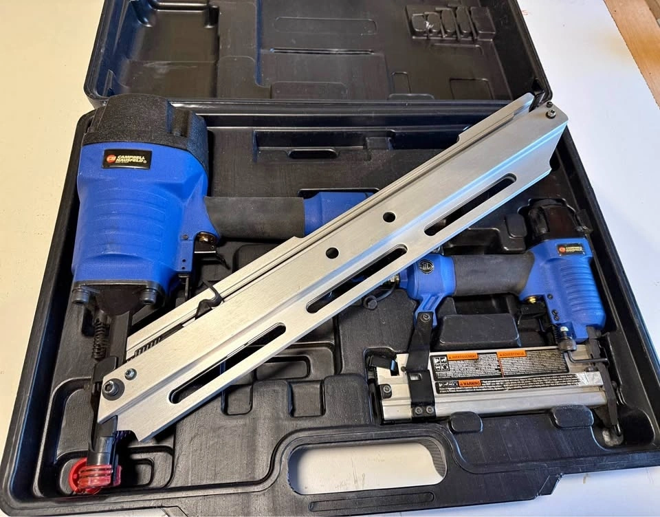 Campbell Hausfeld quality Air nailer set in excellent condition. Comes with a framing nailer that can shoot 2” to 3 1/2” framing nails and a 2-in-1 brad nailer/stapler. Can shoot 3/8” to 2” 18 gauge brad nails in addition to 1/2” to 1 1/2” 1/4 inch crown staples. The sturdy case includes the tools and original instruction booklets. I'm including some 3 1/2” nails with the set.