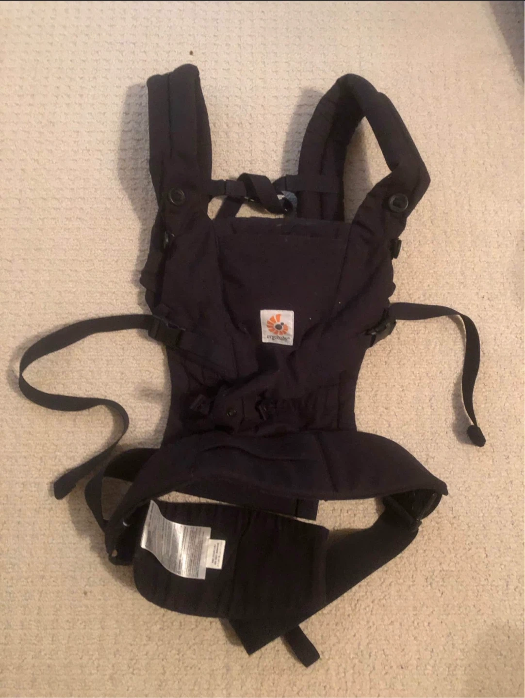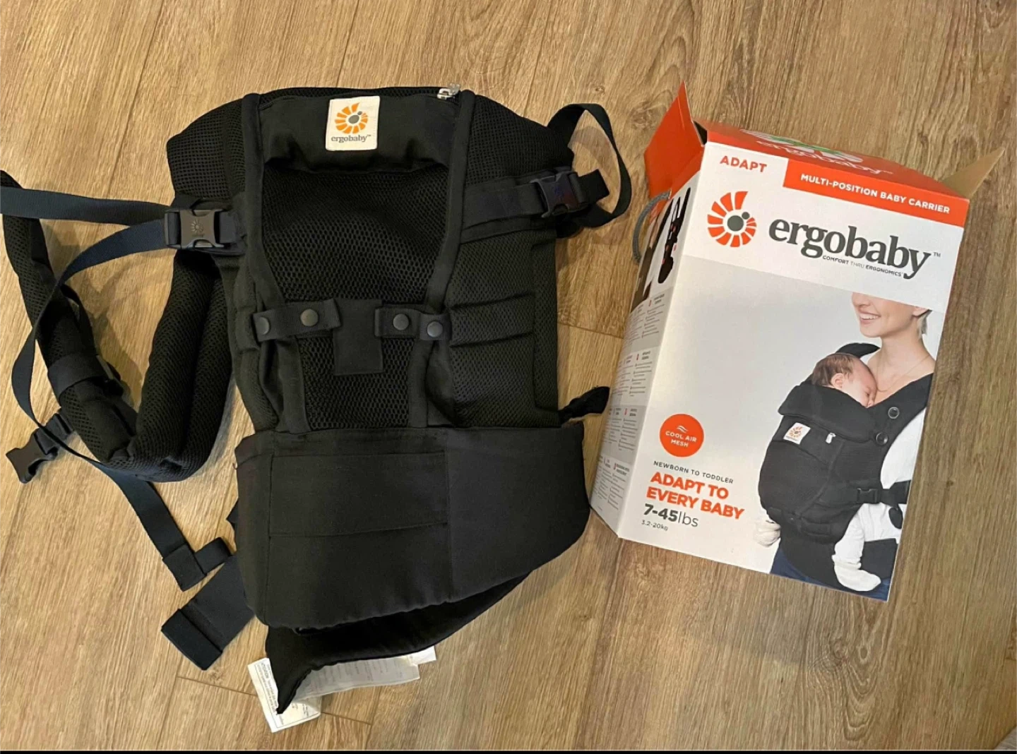 This is an Ergobaby Adapt baby carrier in black. It's designed for newborns to toddlers weighing 7-45 lbs. The carrier offers multiple carrying positions for comfort.