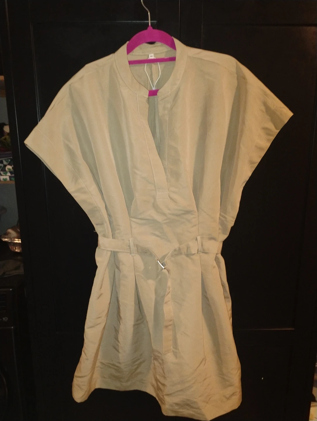 Selling a beige belted dress. It's in great condition and ready for a new home! The dress features a flattering belted waist and a stylish design.