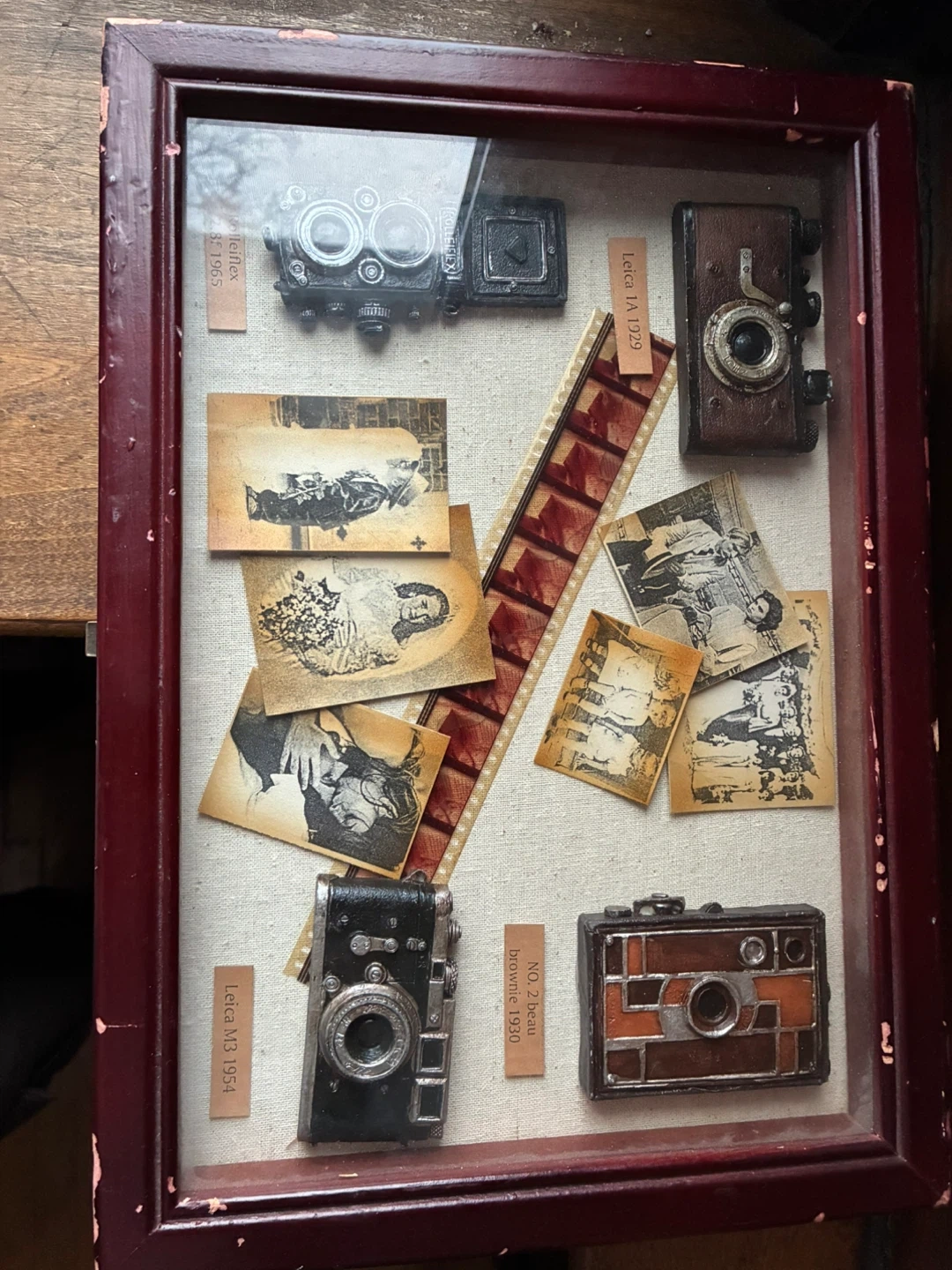 Interesting shadow box the old film and cameras and vintage photos in the upper display portion