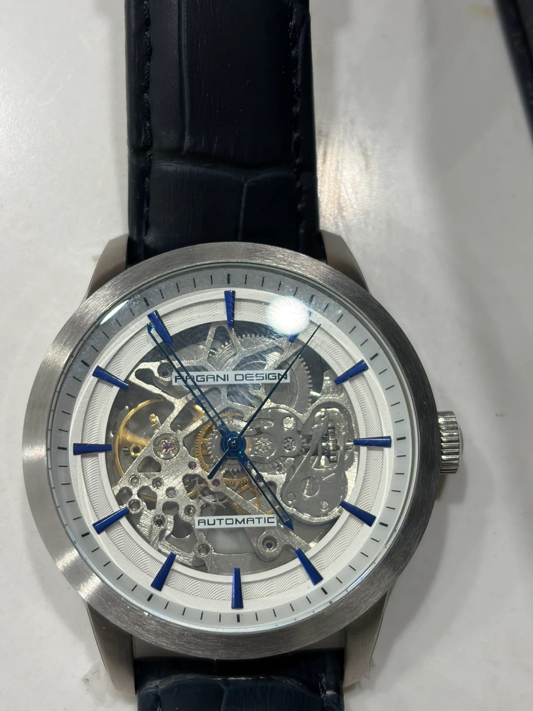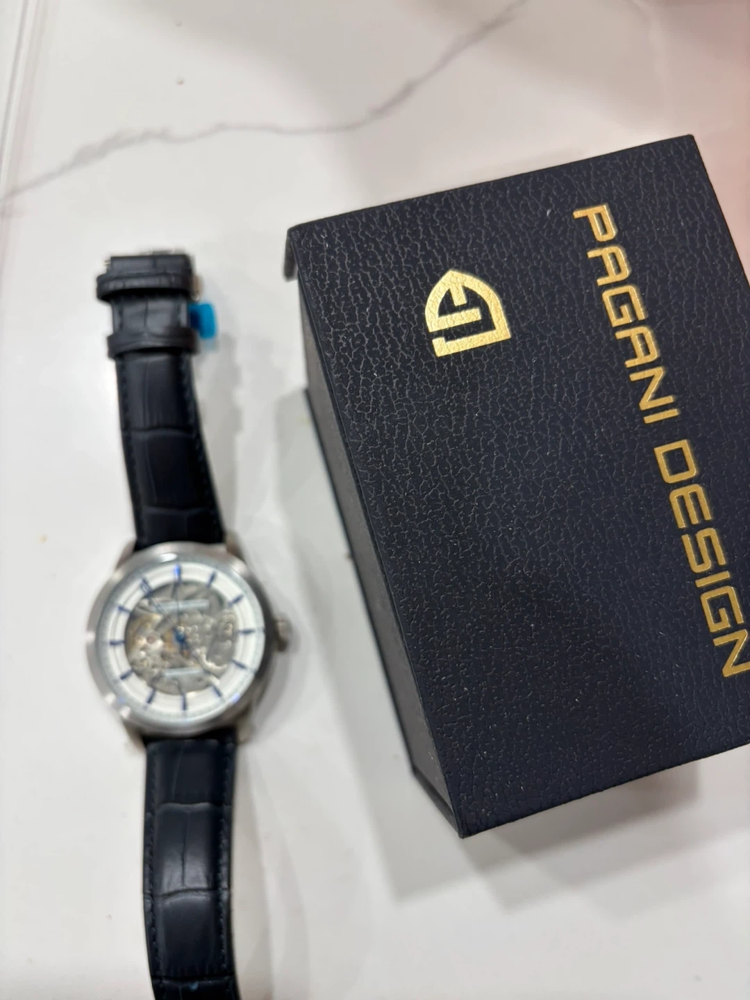 This PAGANI DESIGN watch features a skeleton automatic movement. It has a stainless steel case and a genuine leather strap. The watch comes with its original box.