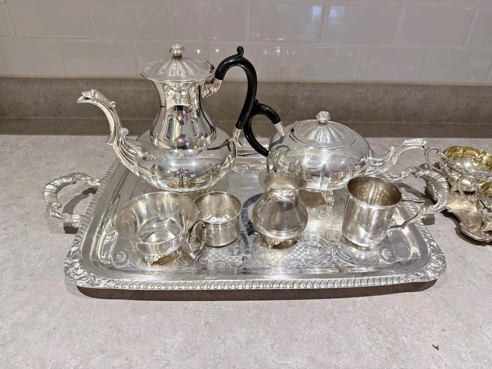 Vintage silver plated tea set. Marlboro Plate E.P. Copper refers to vintage Canadian-made silver-plated hollowware (trays, teapots, goblets) by Morton Parker, featuring a copper base with a silver plating (Electroplated/E.P.), often marked with "Lead Mounts" for weighted bases and "Made in Canada," popular for decorative serving pieces. These items, made from the mid-20th century, show signs of age like patina but are sought for their classic style. 95$ OBO