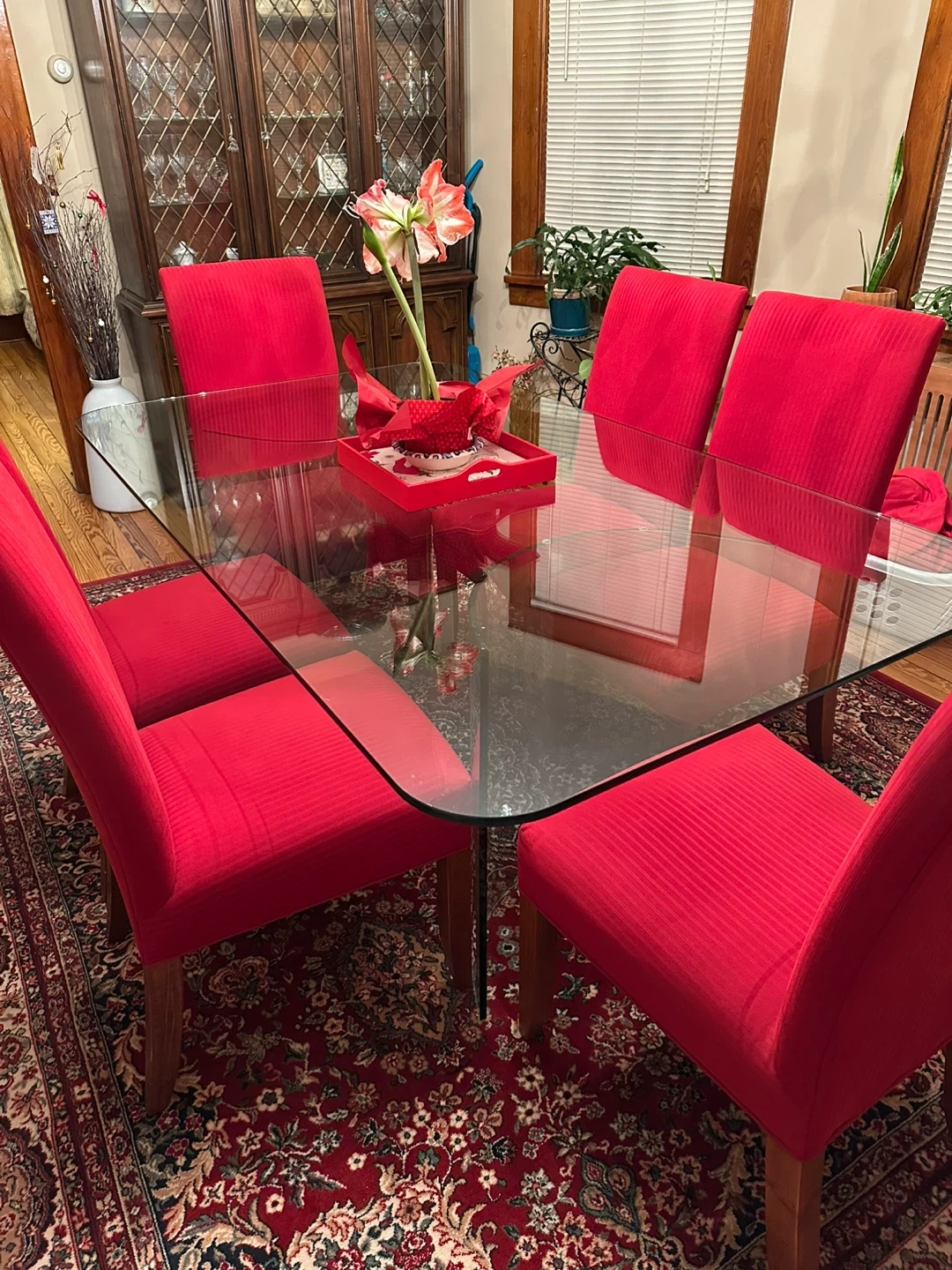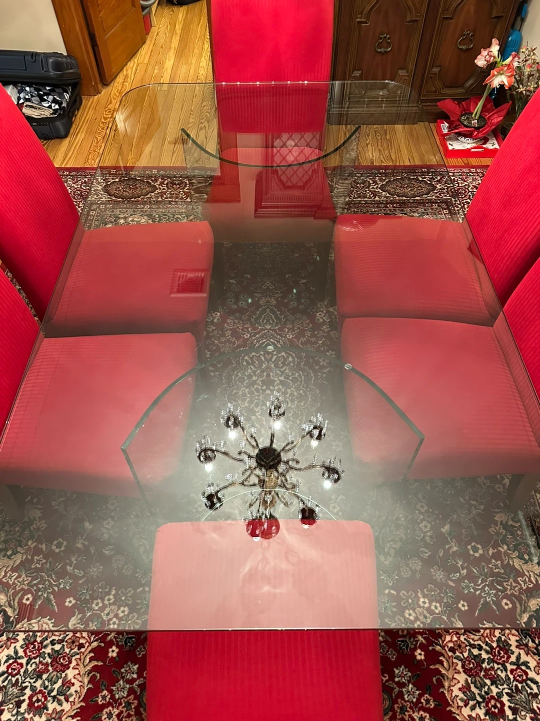Selling a glass top dining table that comes with 6 red upholstered chairs. It would be a great addition to any dining room. The chairs are a vibrant red color and the glass top is in good condition. Feel free to ask any questions!