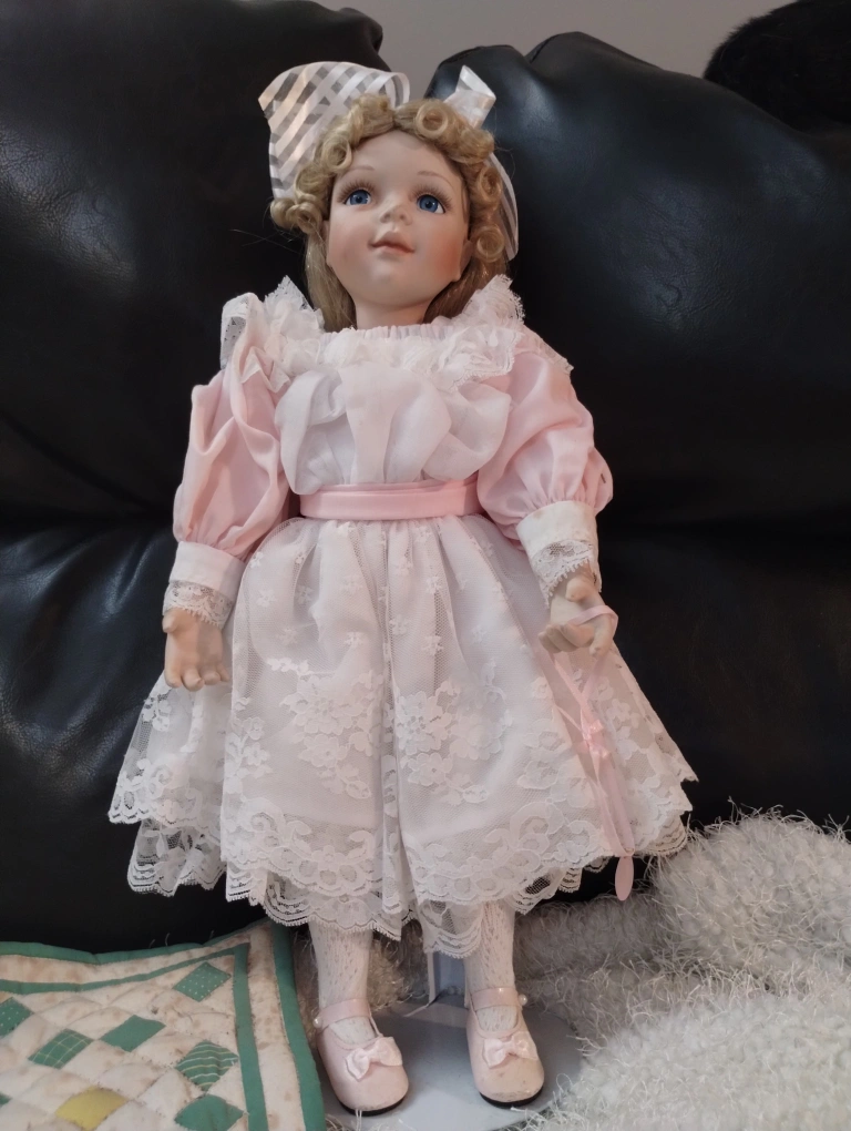 Beautiful porcelain doll. She wears a pink dress with lace detailing and pink shoes. Blonde curly hair and a pretty face. Great for collectors. By Ashton Drake