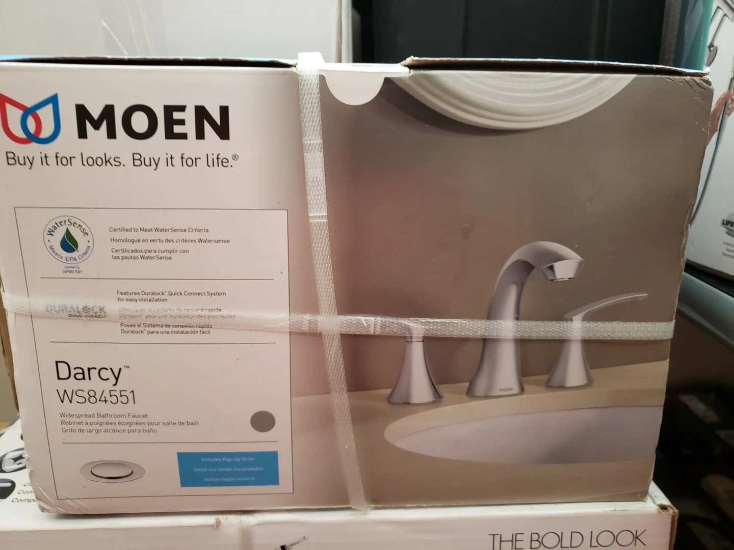 This is a MOEN Darcy WS84551 widespread bathroom faucet. It features the Duralock Quick Connect System for easy installation. Includes a pop-up drain.