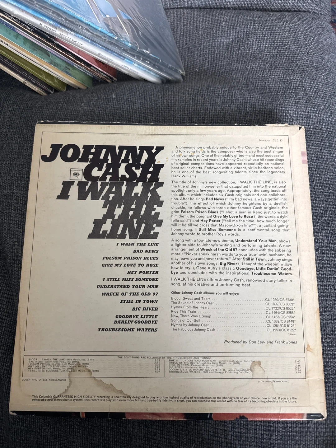 Johnny Cash's I Walk the Line vinyl record, CL 1539. This Columbia High Fidelity recording features songs like 'Understand Your Man' and 'Folsom Prison Blues'.