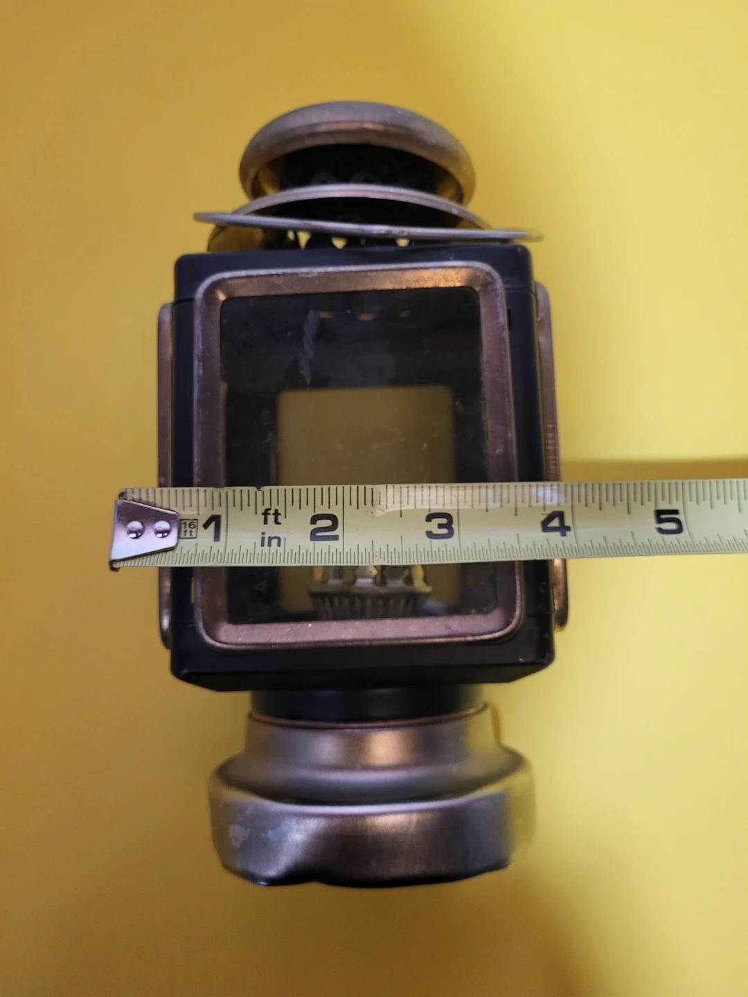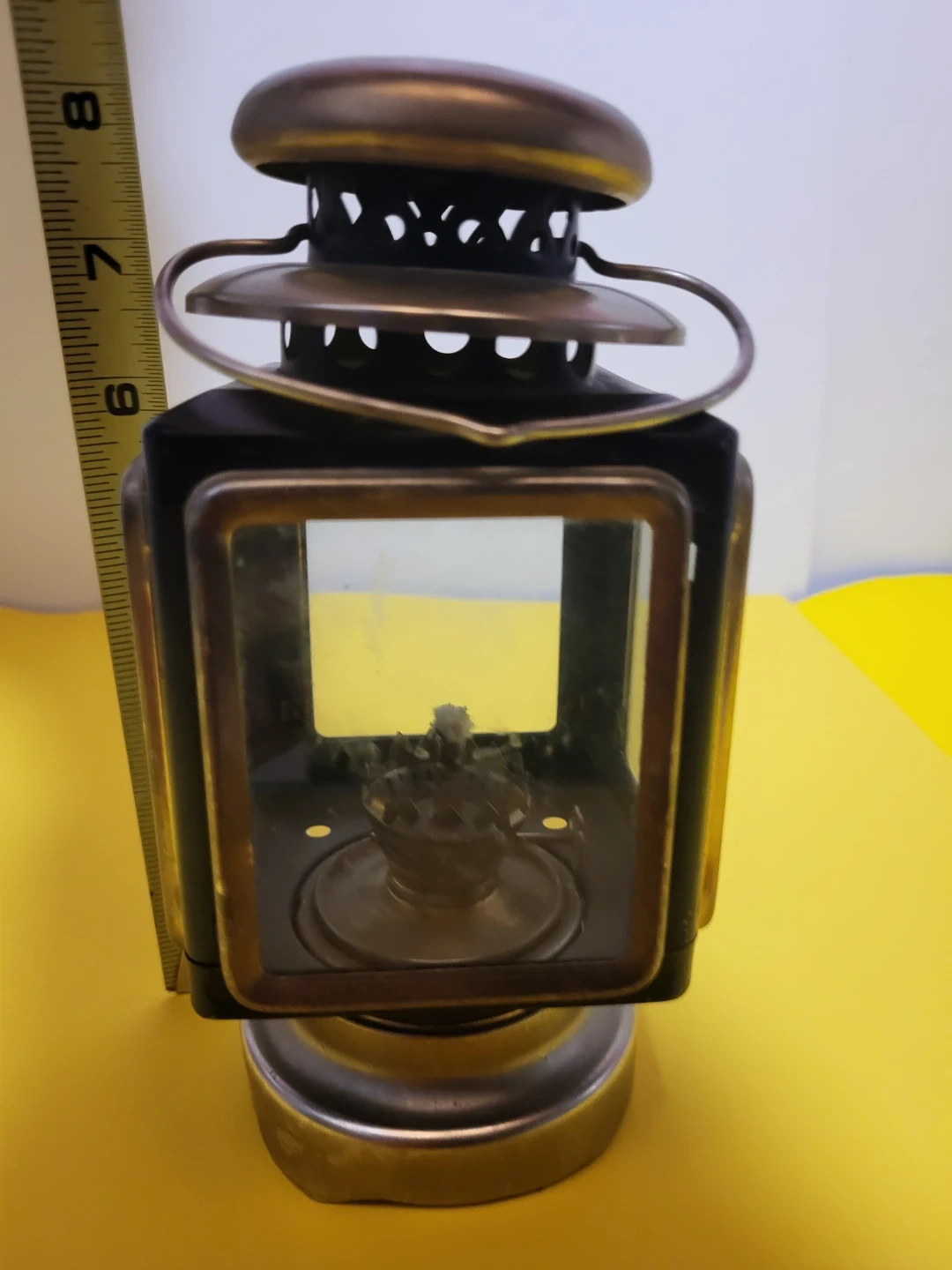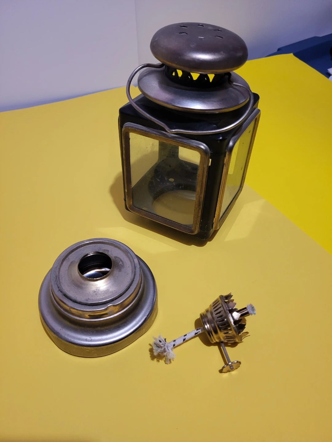 This is a vintage oil lantern with glass panes. It's made of metal and glass. The burner assembly and base are removable.