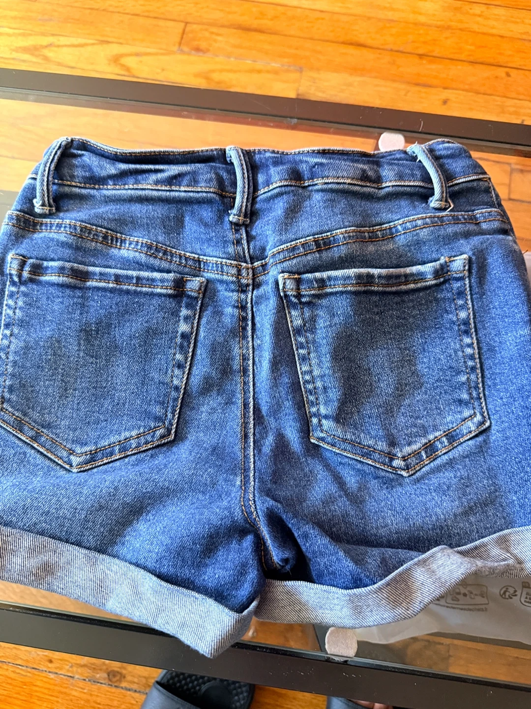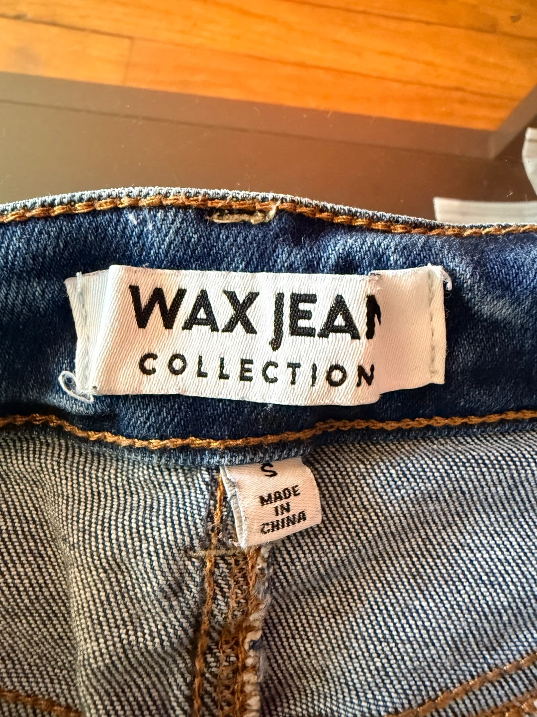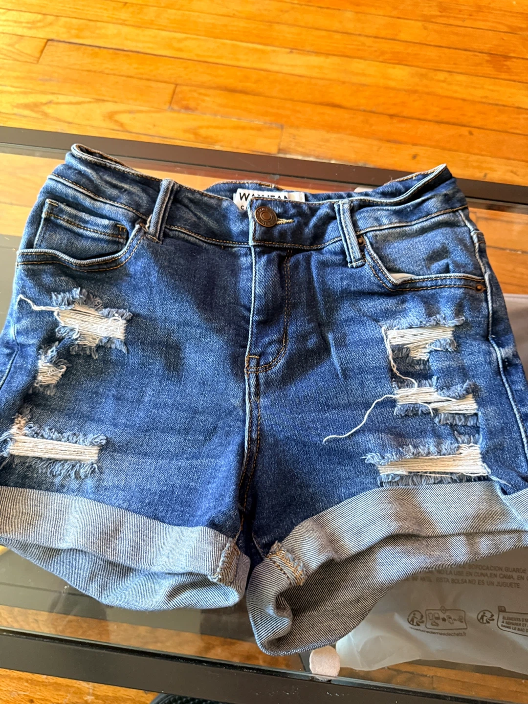 These are Wax Jean Collection denim shorts. They're a distressed style with a rolled hem. Size is S. Made in China. These shorts are a great casual addition to your wardrobe!