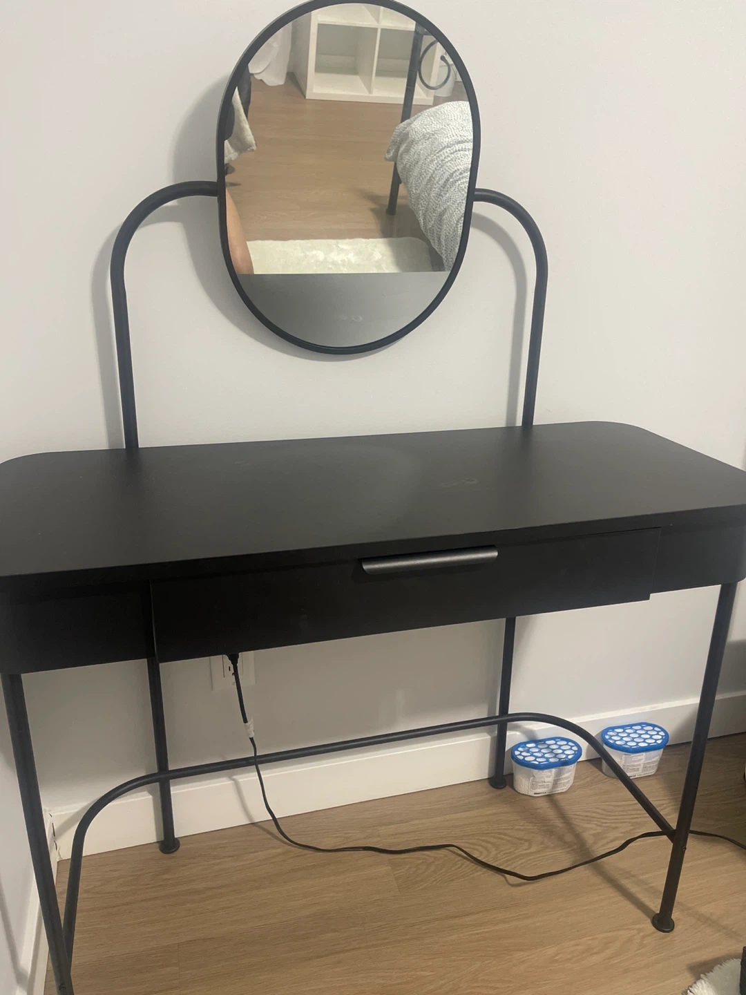 This sleek black vanity table features a single drawer for storage and comes with a stylish oval mirror. It's perfect for getting ready in the morning. The metal frame offers durability. It has a modern design.