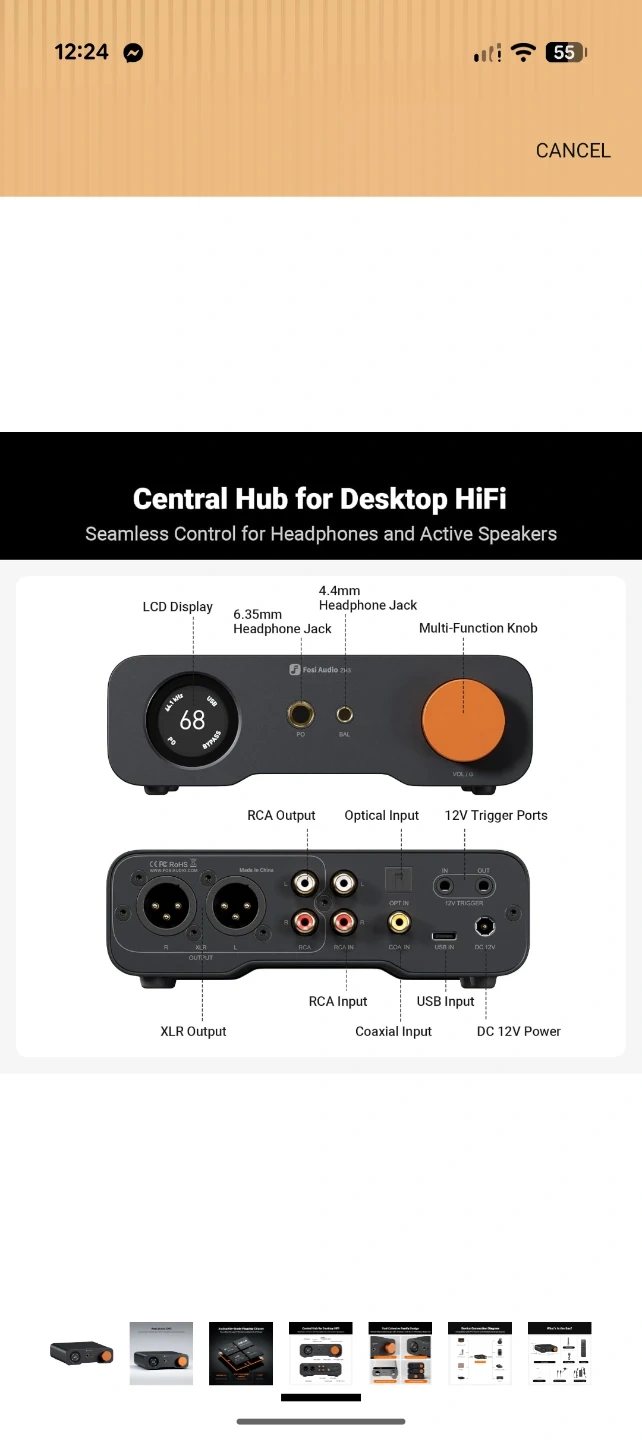This is the Fosi Audio ZH3, an all-in-one desktop HiFi DAC/headphone amplifier/preamp. It features a 1.5-inch LCD display and a multi-function control knob. The unit has aluminum alloy construction and supports PCM 32bit/768kHz and DSD512 sampling rates. It offers 2570mW x 2 max power output.