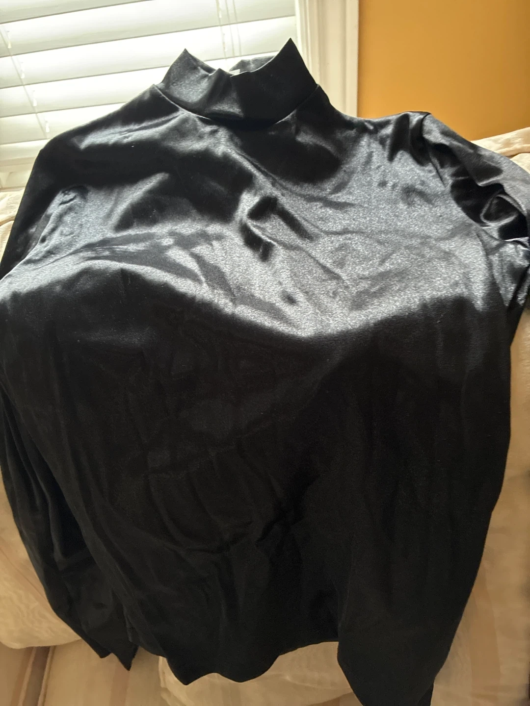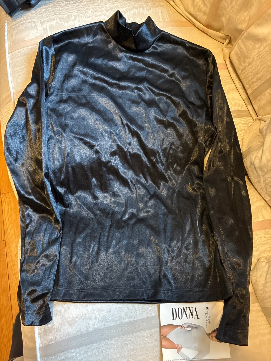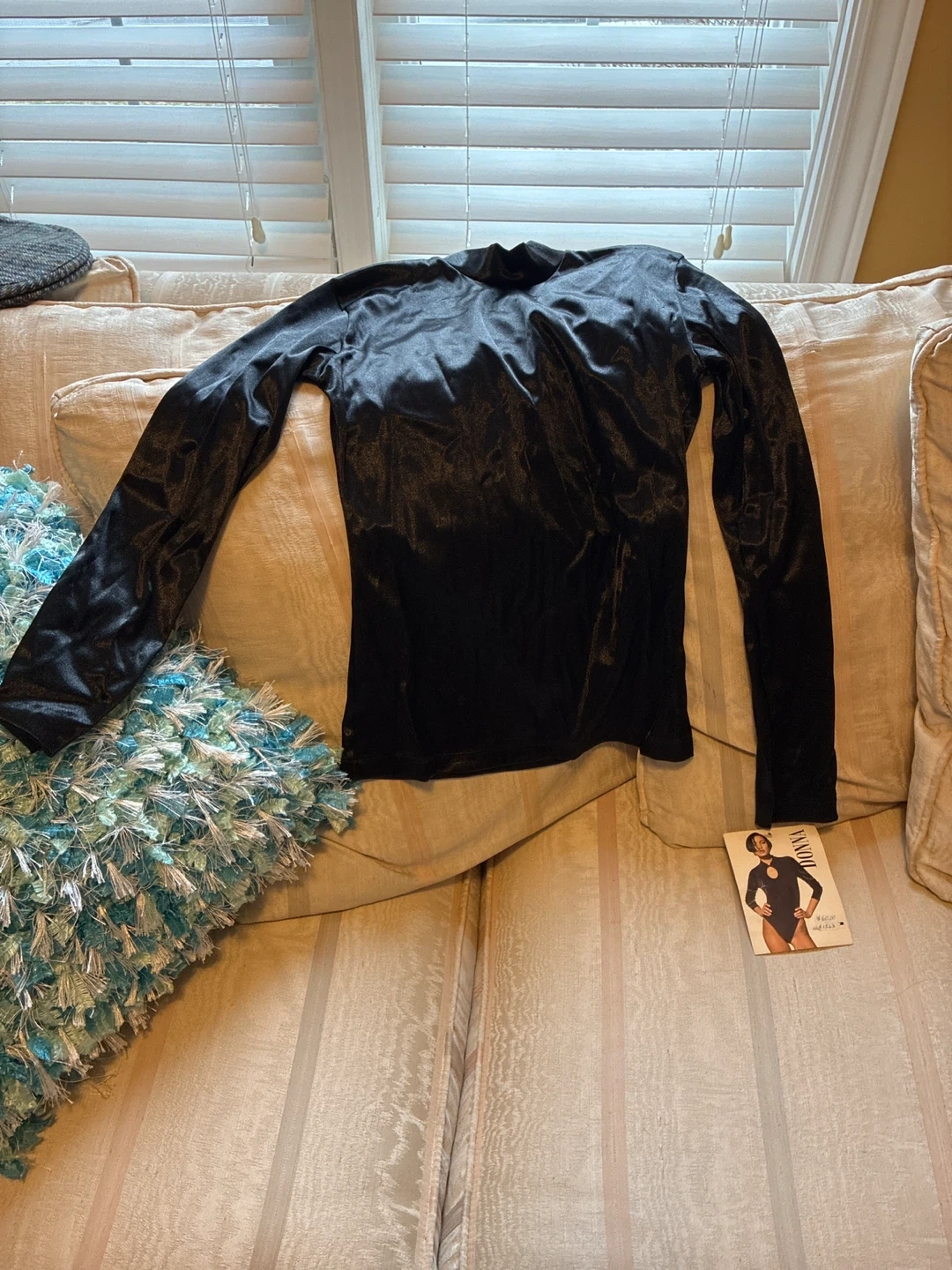 This black long sleeve top features a mock neck design. It's made from a shiny, smooth material. This top is suitable for layering or wearing on its own.