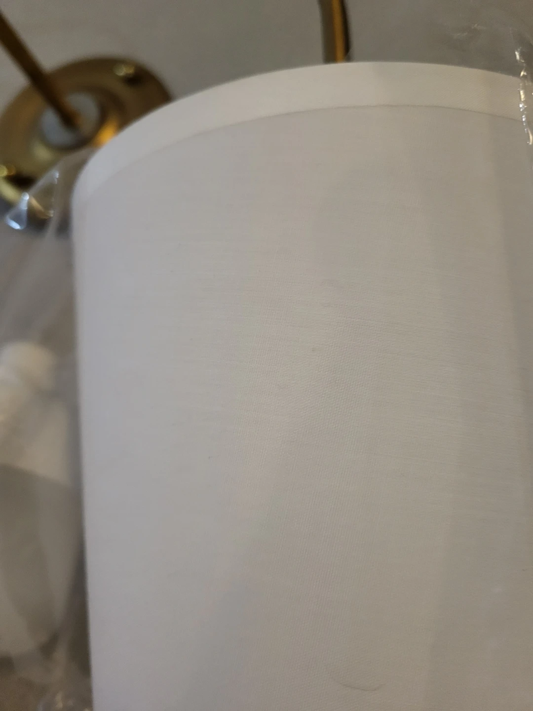 This wall light fixture has a brass finish and comes with two white fabric shades. It's suitable for indoor lighting needs.