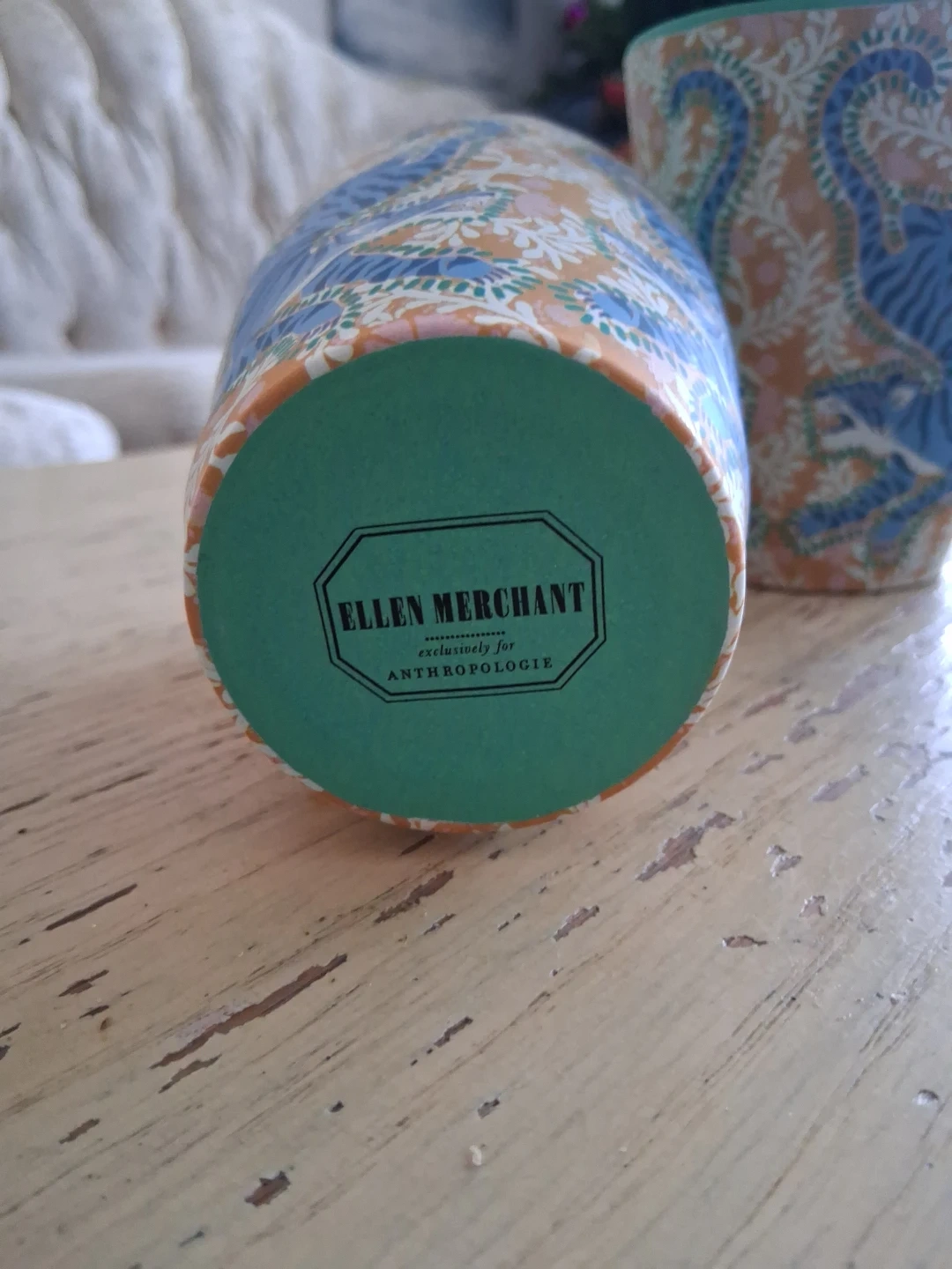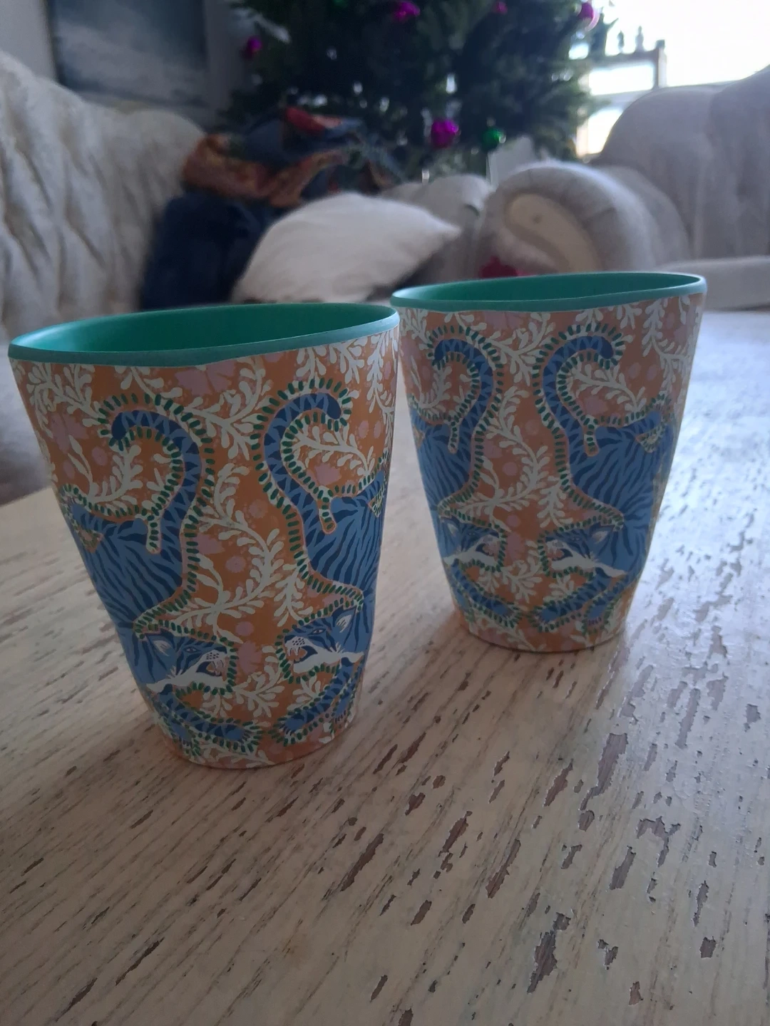 Set of two decorative tumblers featuring a vibrant orange, blue, and pink floral and animal print. Made exclusively for Anthropologie by Ellen Merchant. Perfect for a Housewarming gift or just for you! ❤️
