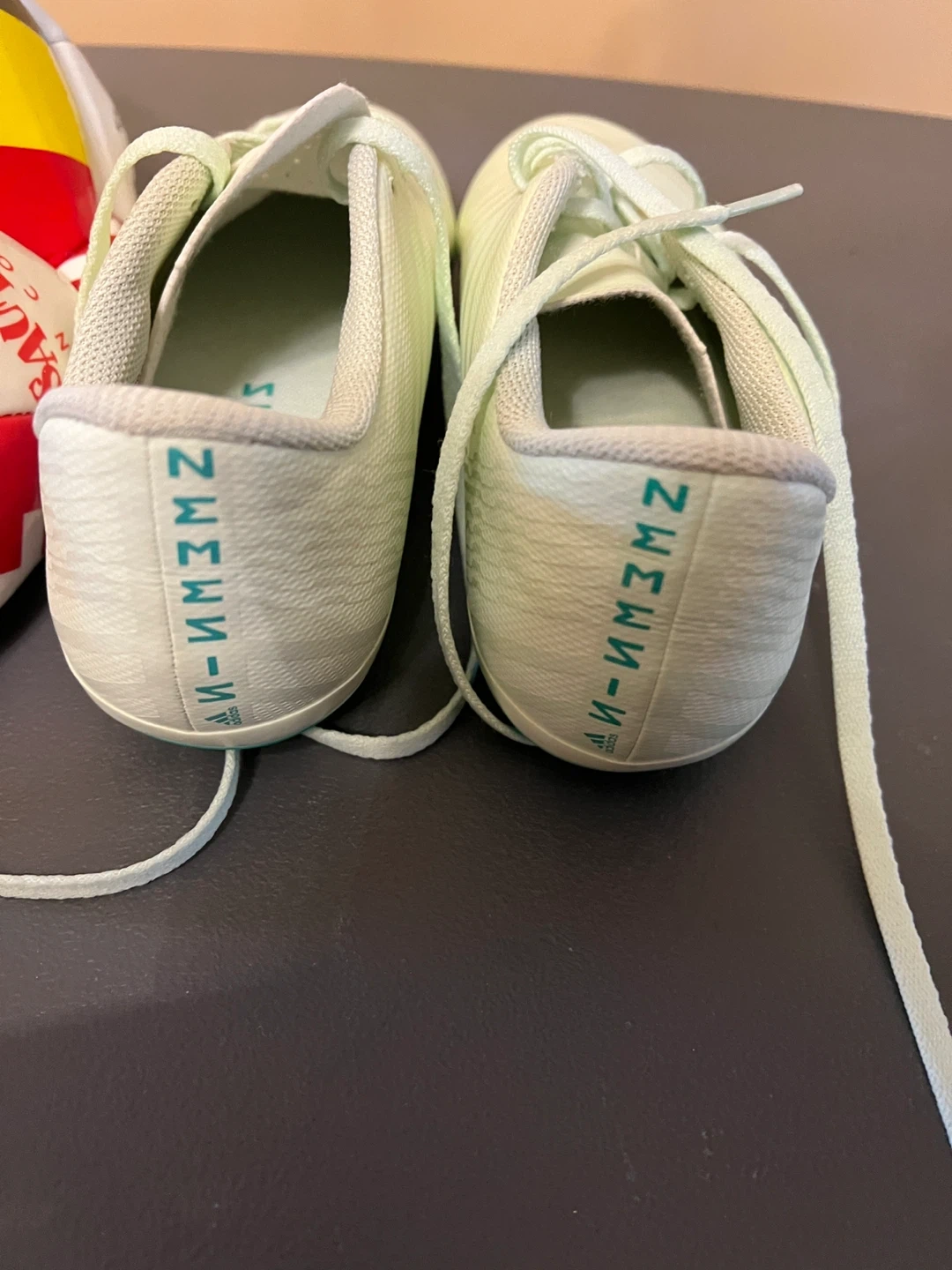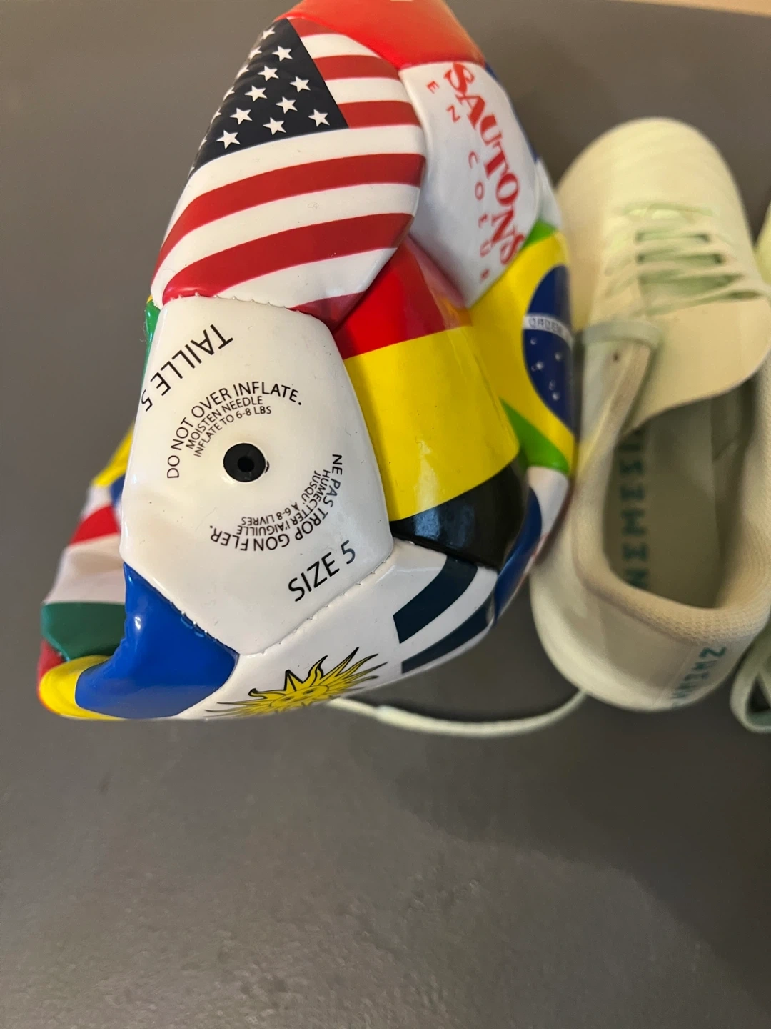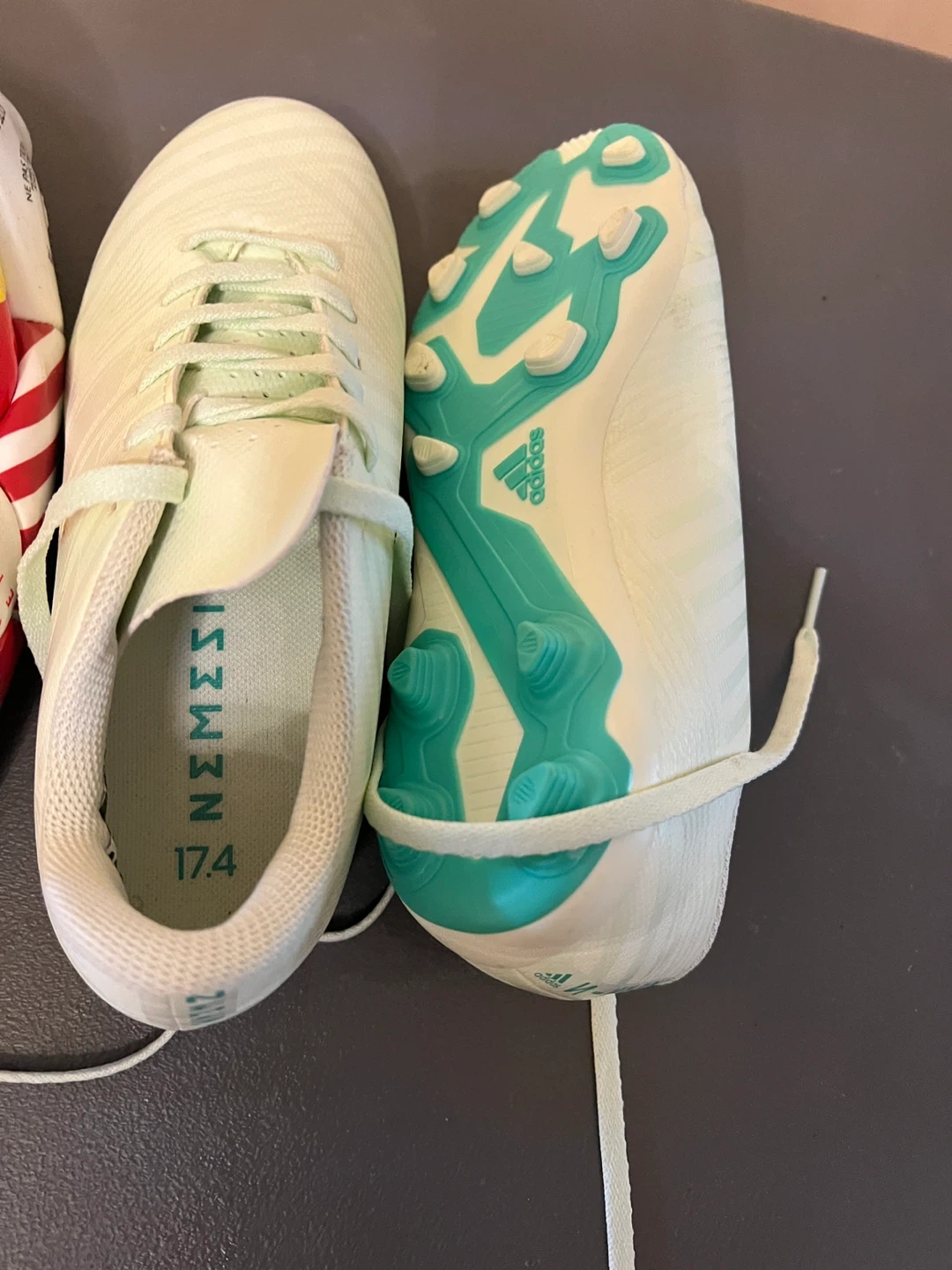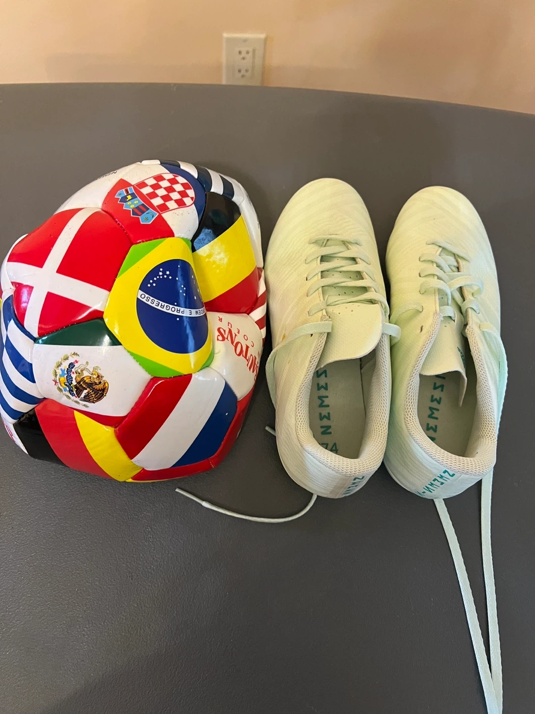 Light green Adidas soccer cleats, size 17.4. Size 3 1/2 she was about 9 1/2 inches in length Includes a soccer ball featuring international flags. Ball size is 5. Item comes from a pet and smoke free home. Porch union/401/Pickering for pick up. The price is for both items together.