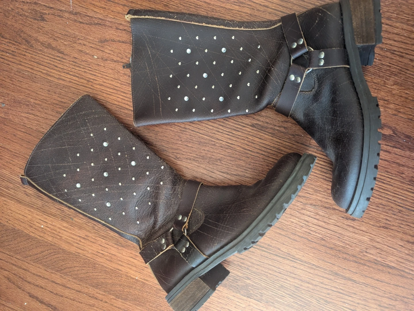 These ALDO boots are made from dark brown leather and feature decorative silver studs. They have a shaft height of approximately 14 inches and a buckle strap detail around the ankle. The sole is black rubber with a lug pattern. Made in Italy.