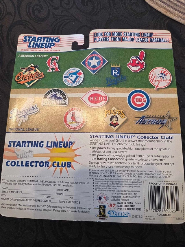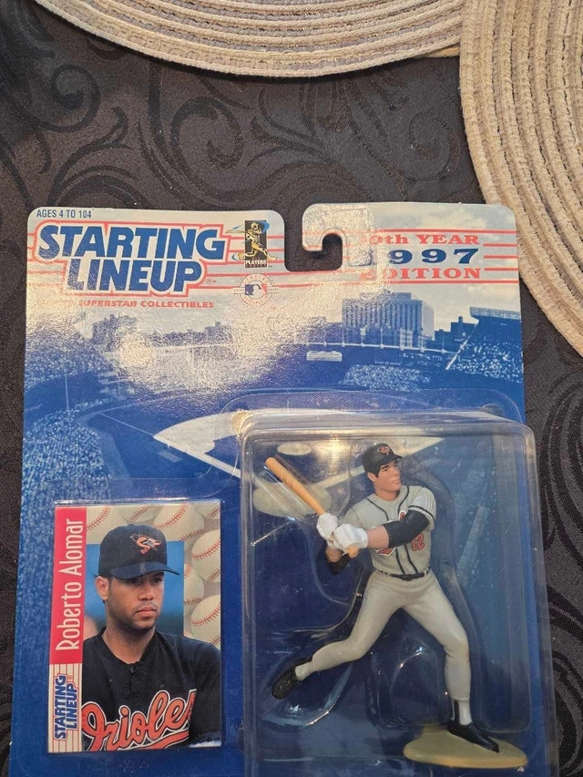 This collectable is a 1997 Starting Lineup Roberto Alomar action figure, still new in the original packaging. A must-have for any serious sports memorabilia collector, it captures Alomar in his prime. * 9th Year 1997 Edition * Superstar Collectibles If this ad is still up, yes, it’s still available! I have too much stuff, and it needs to go to a good home!