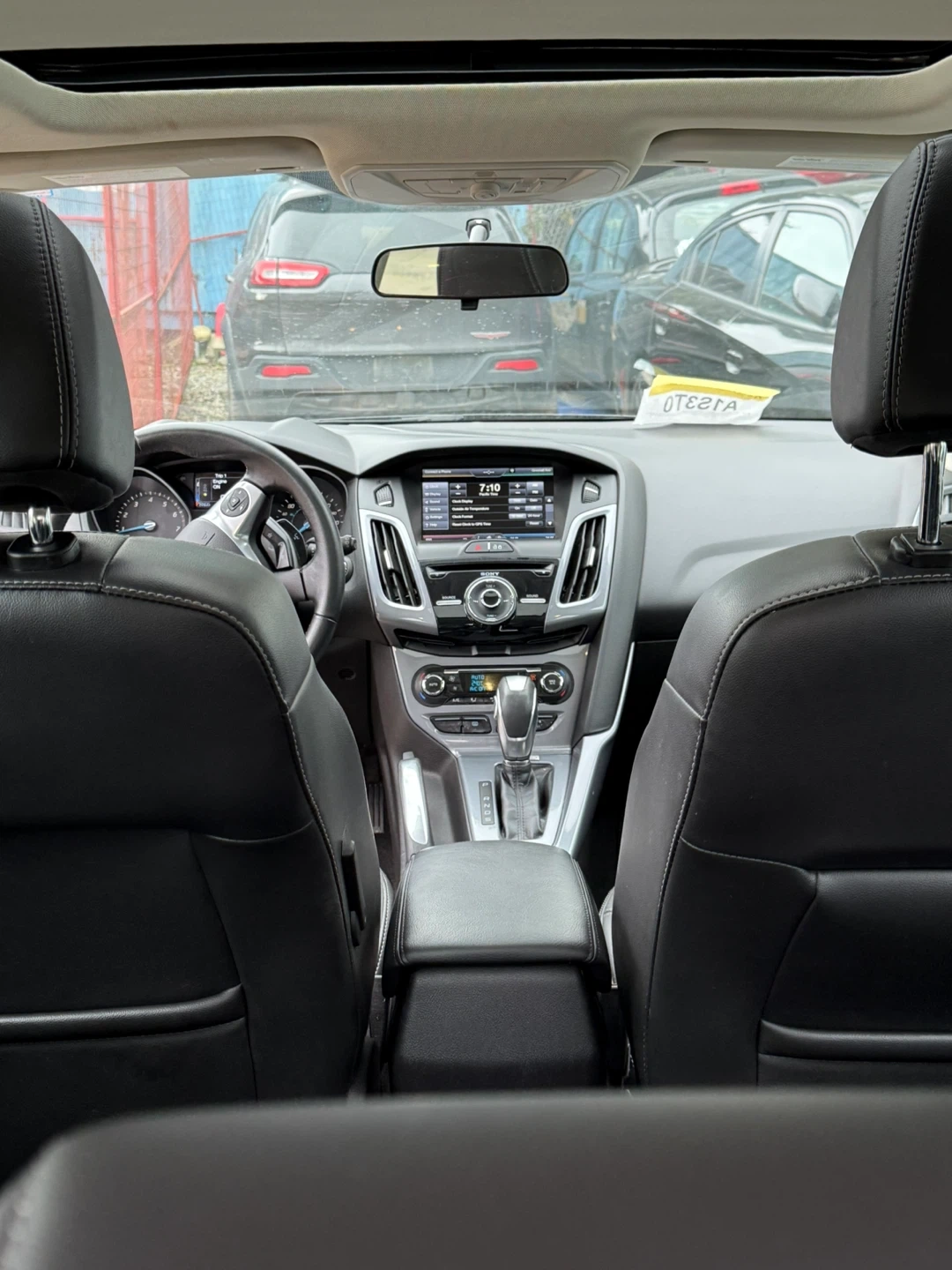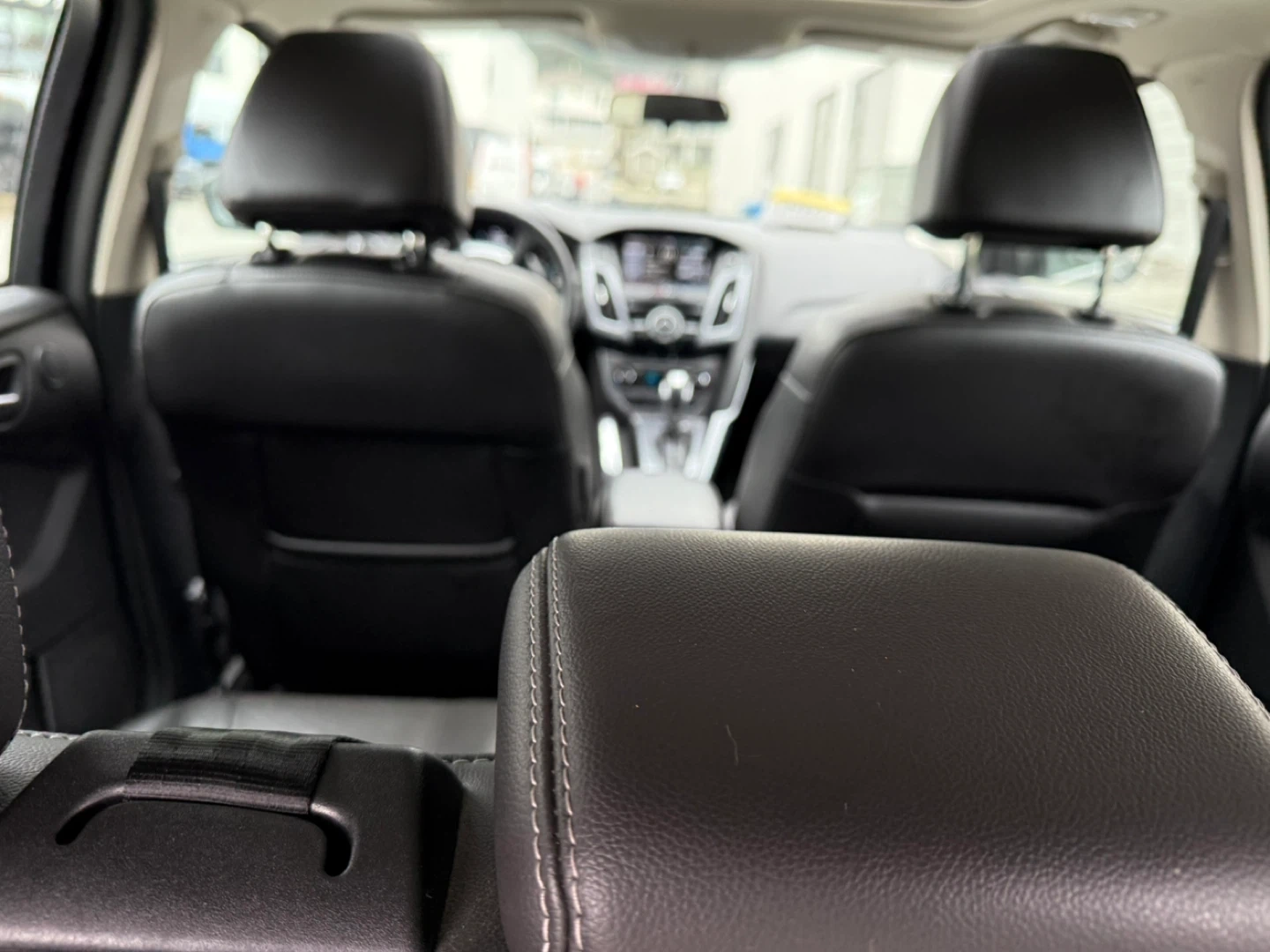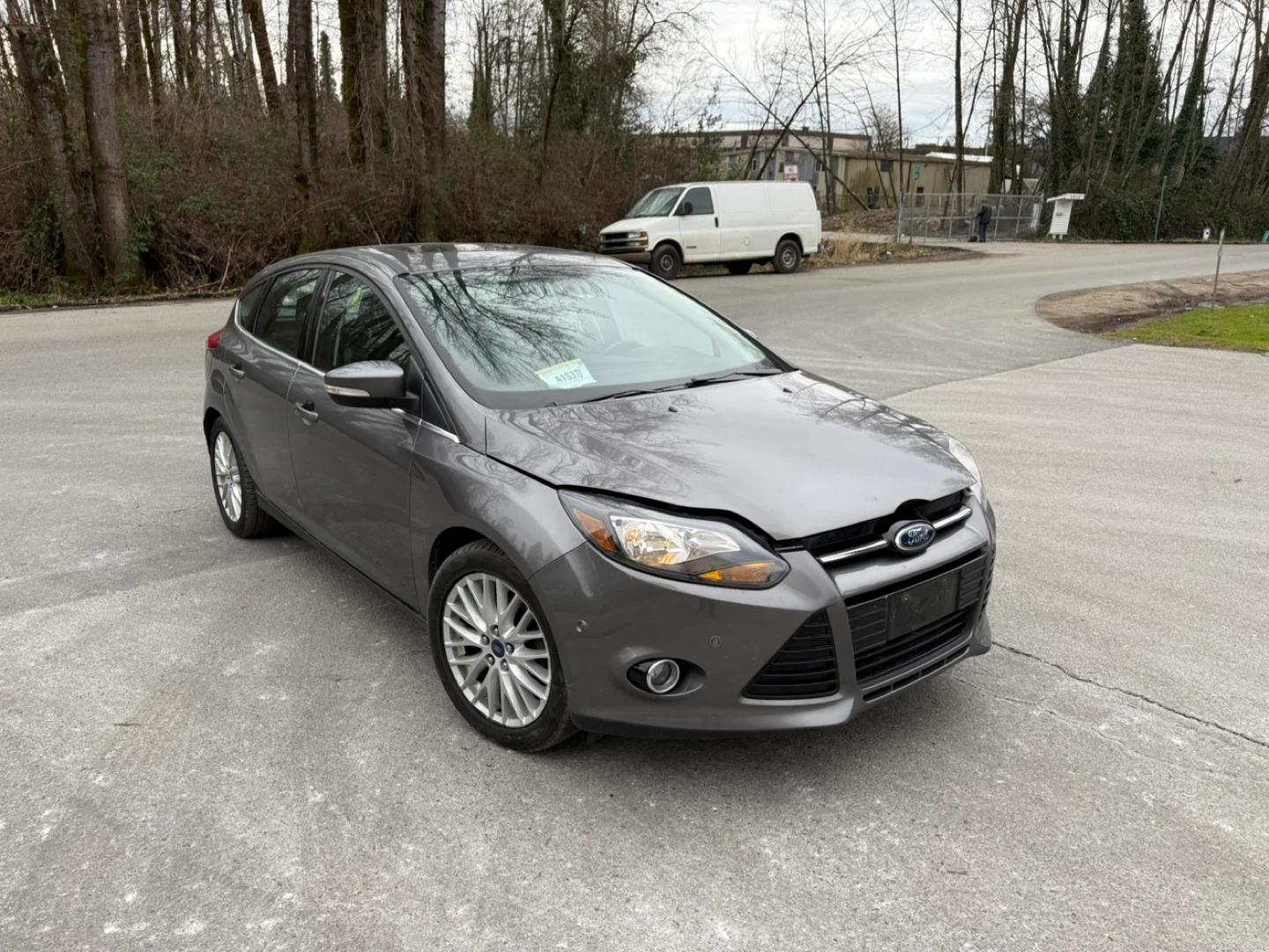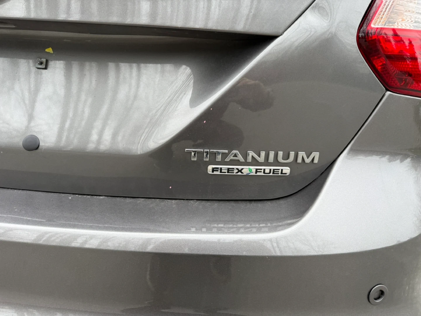 This is a 2013 Ford Focus Titanium with Flex Fuel capability. It's a four-door hatchback with a grey exterior. The interior features black leather seats.