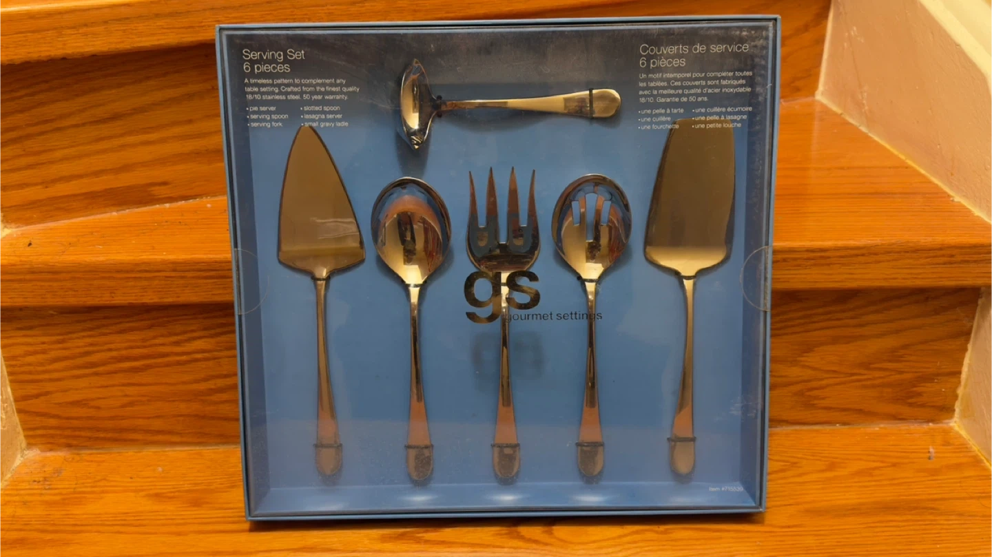 Brand new Gourmet Settings 6-piece serving set, still sealed in original packaging. Crafted from premium 18/10 stainless steel for durability, a smooth polished finish, and excellent resistance to rust and corrosion. Timeless design that complements any table setting.