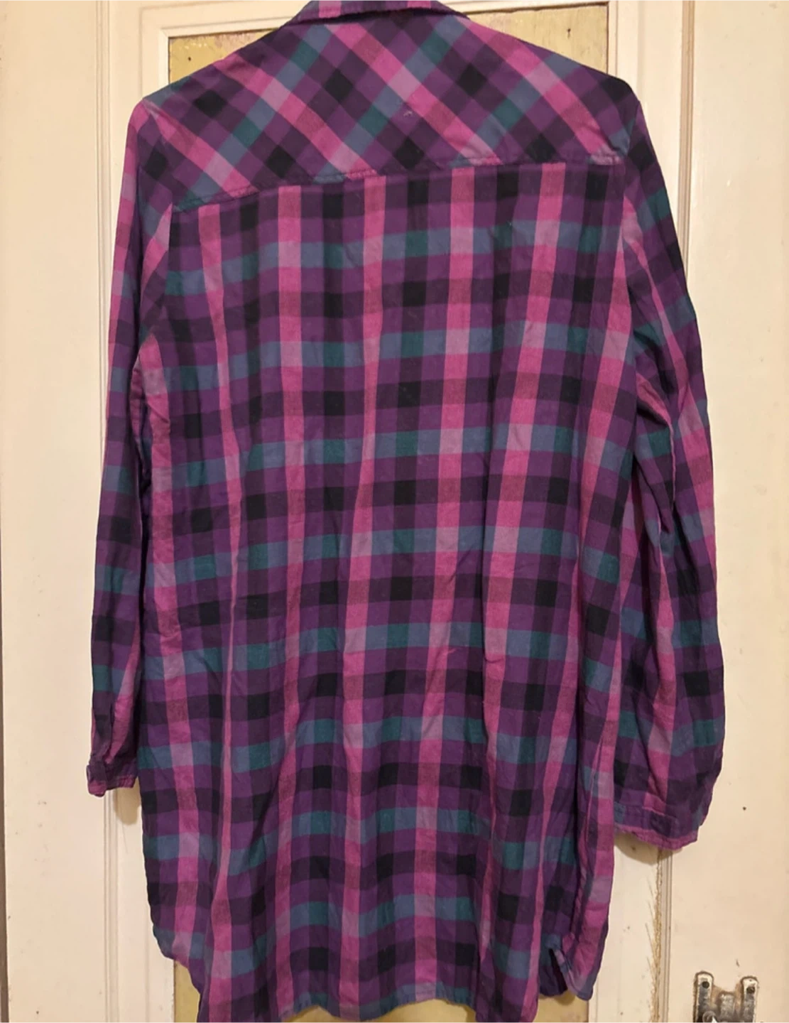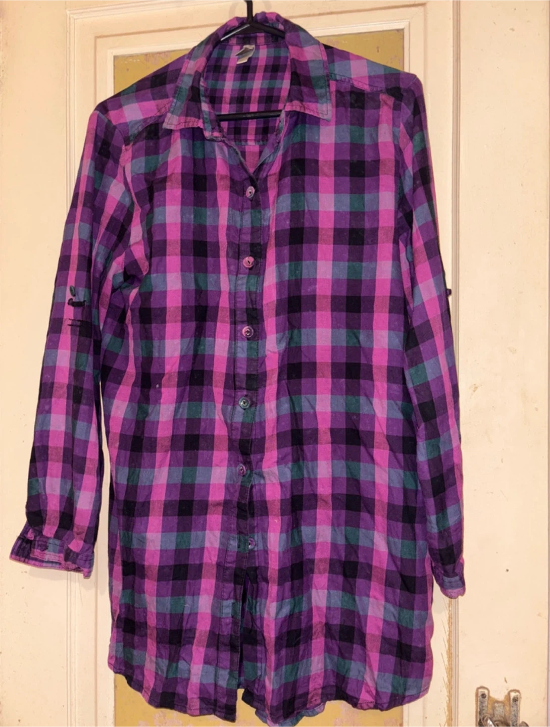 This is a used Miyu purple plaid flannel in size large (G/L). It's perfect for layering or wearing on its own for a casual, comfy look. I'm cleaning out my closet so you can add this to your wardrobe!