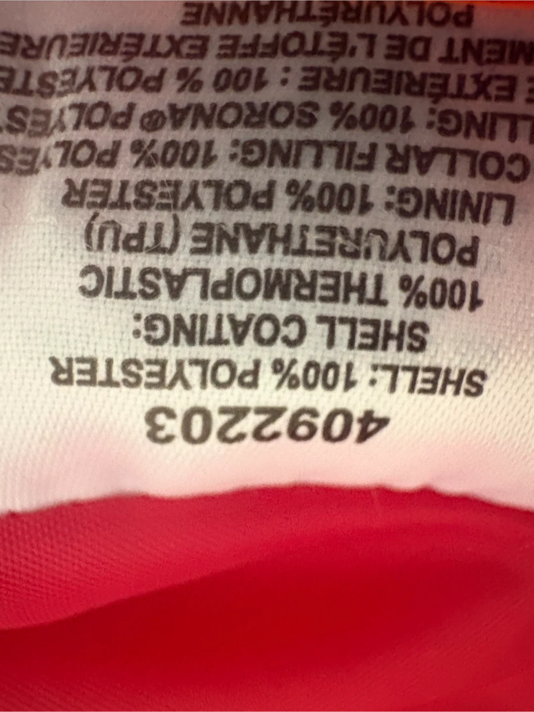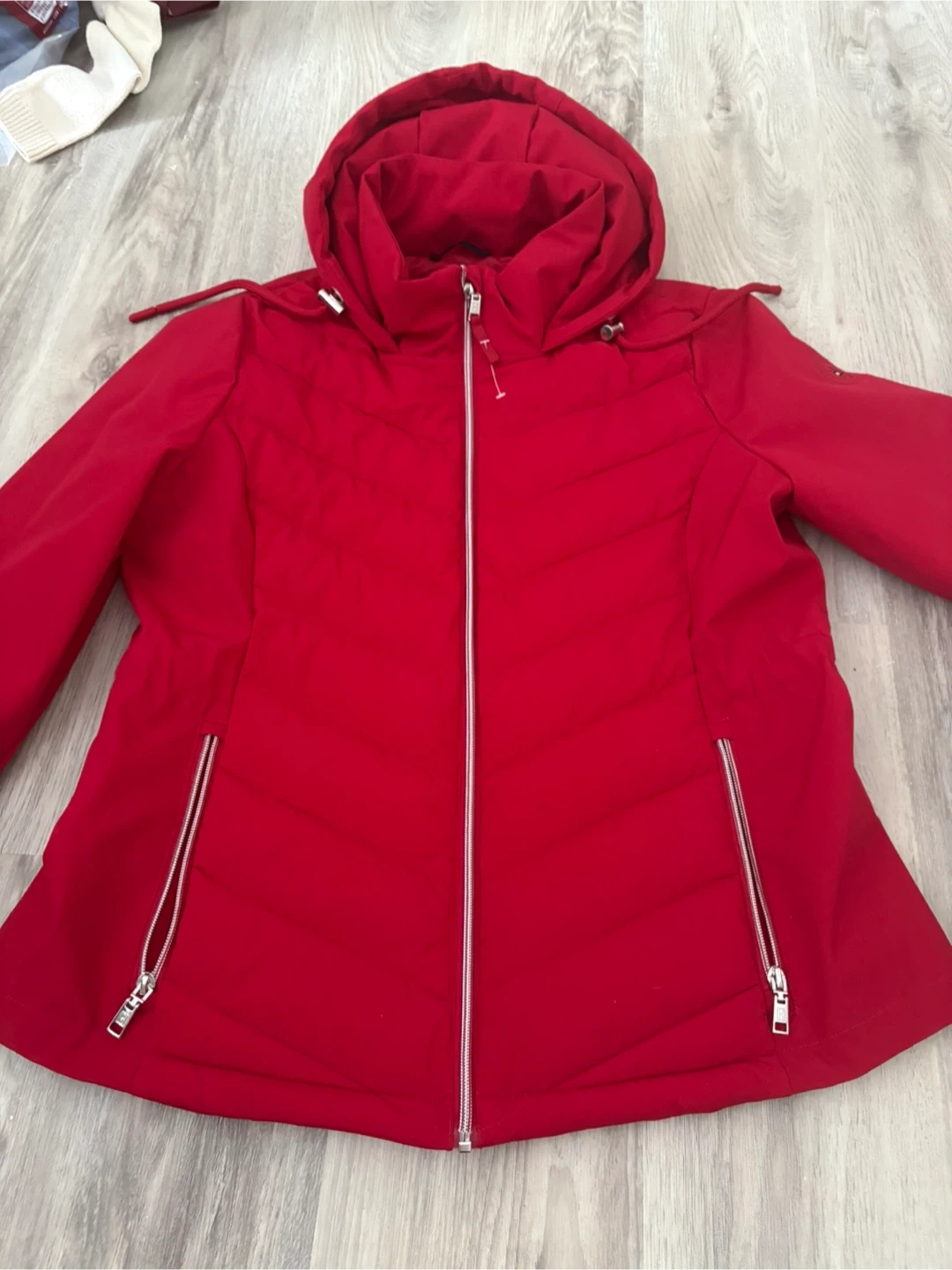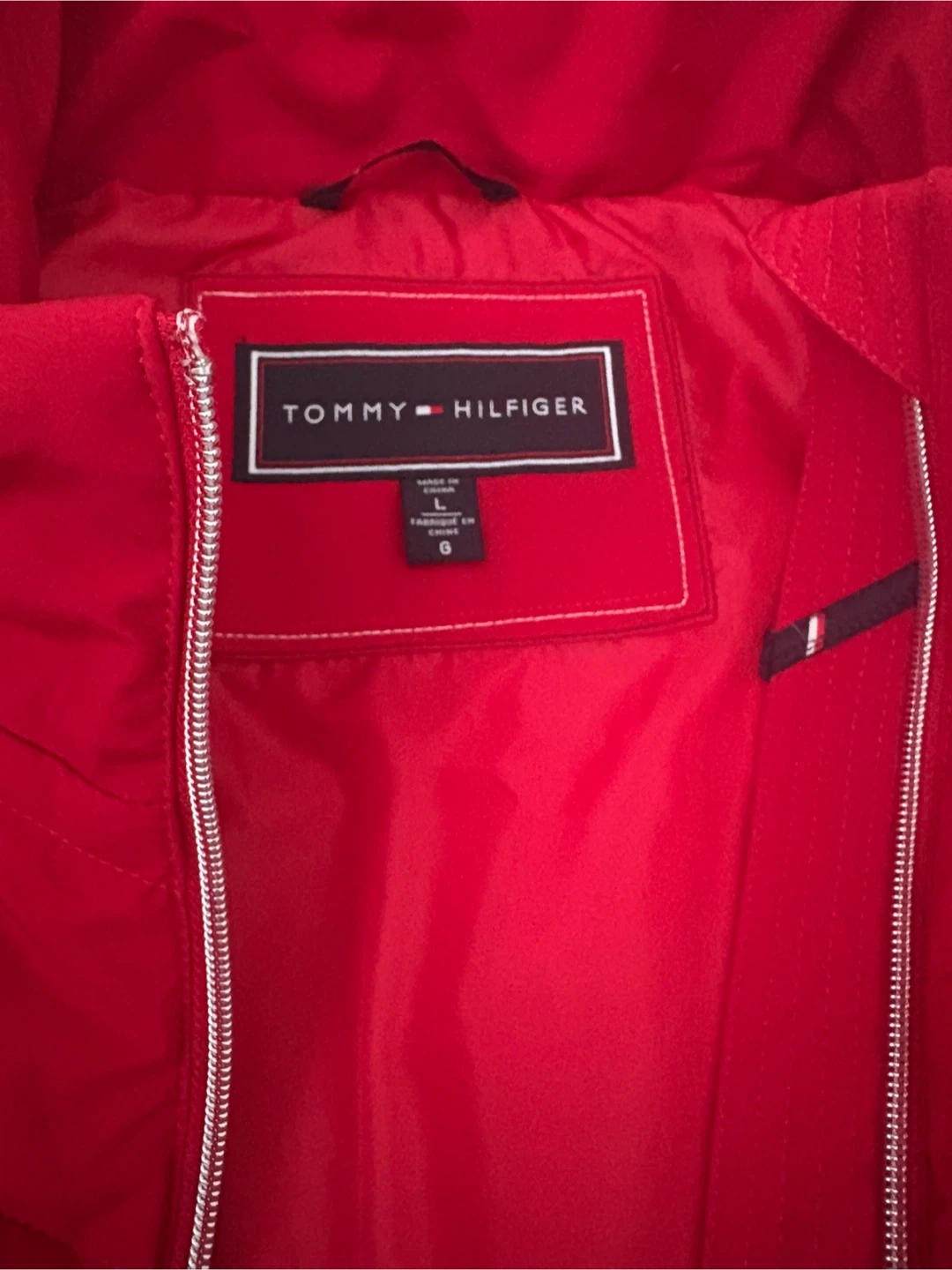 This red Tommy Hilfiger hooded puffer jacket is ready for cooler weather! It features a full zip front and zippered pockets. Size LG
