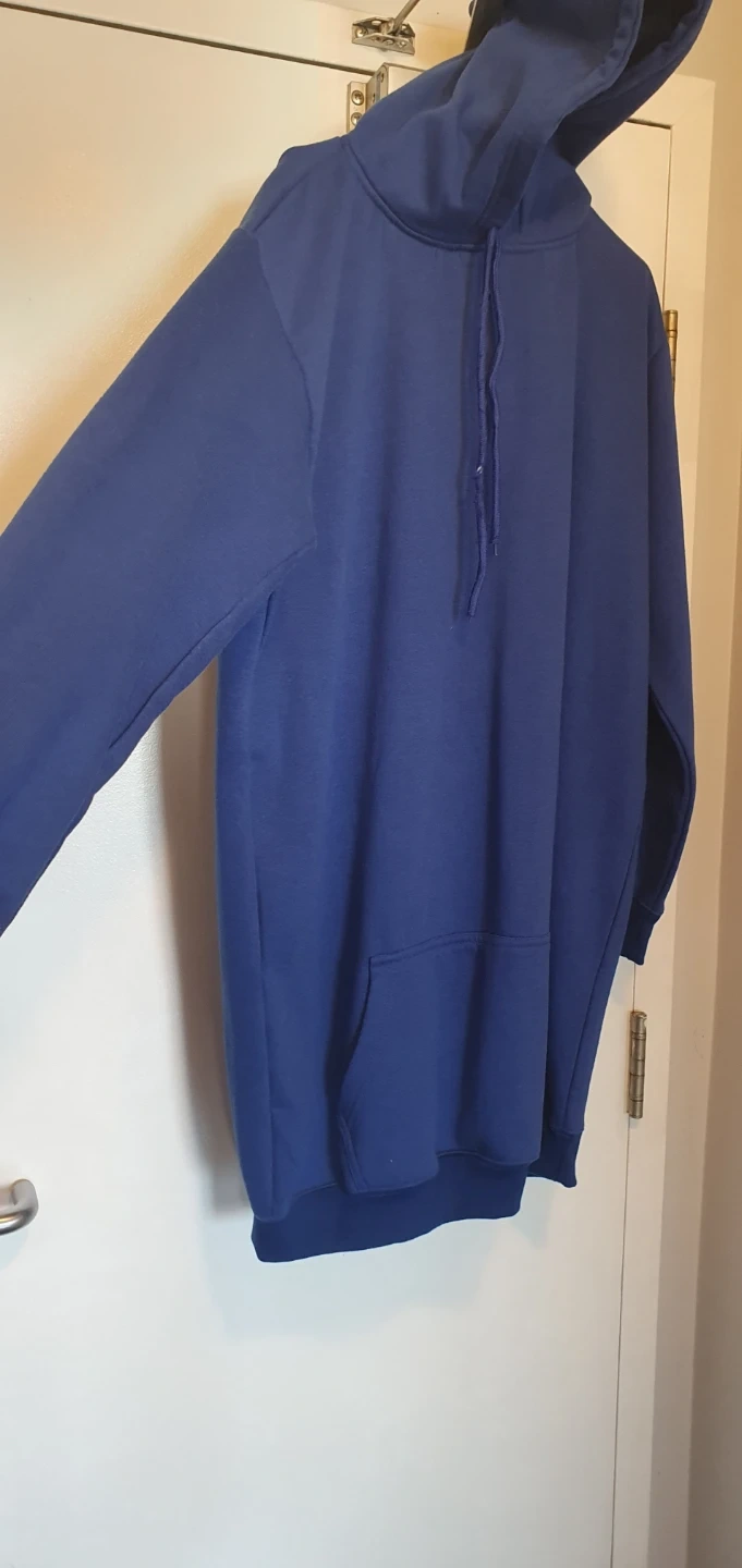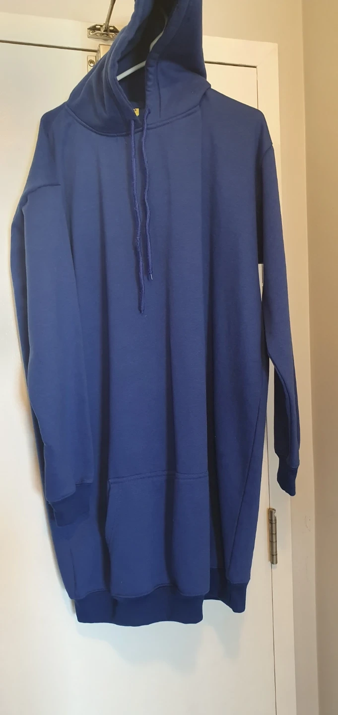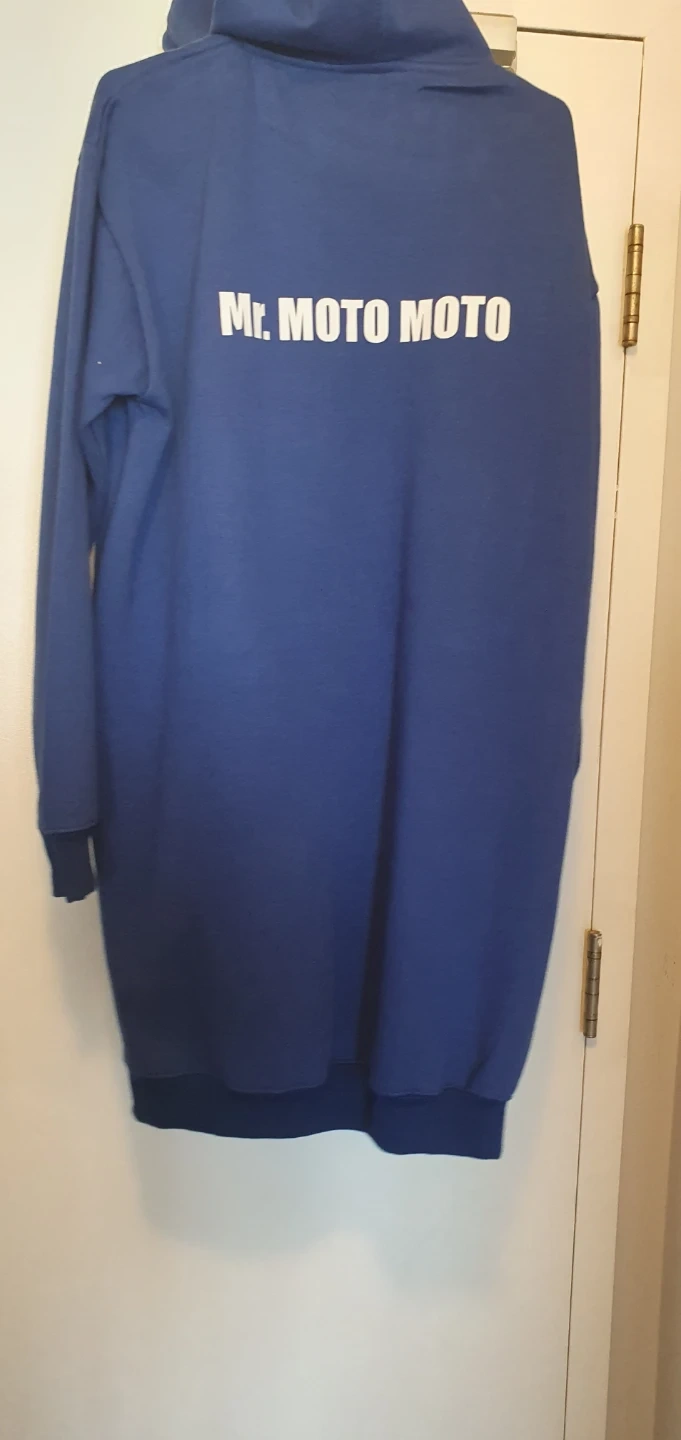 This is a blue hoodie dress with the "Mr. MOTO MOTO" graphic on the back. It has a front pouch pocket and a drawstring hood. The material is a soft fleece blend, perfect for casual wear. Length is approximately 37 inches.