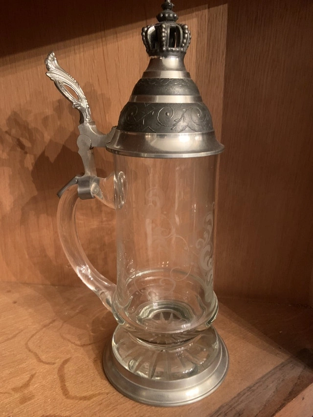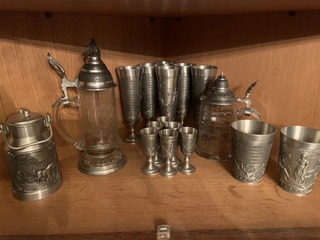 6 tall glasses 8” sold 6 small shot glasses 3.75” $10 each 2 cups 4.5” sold Large glass and pewter stein 11” $60 Small glass and pewter stein 8.5” $50 Milk jug 7” sold. Vintage, Antiques. For Sale By: Owner.