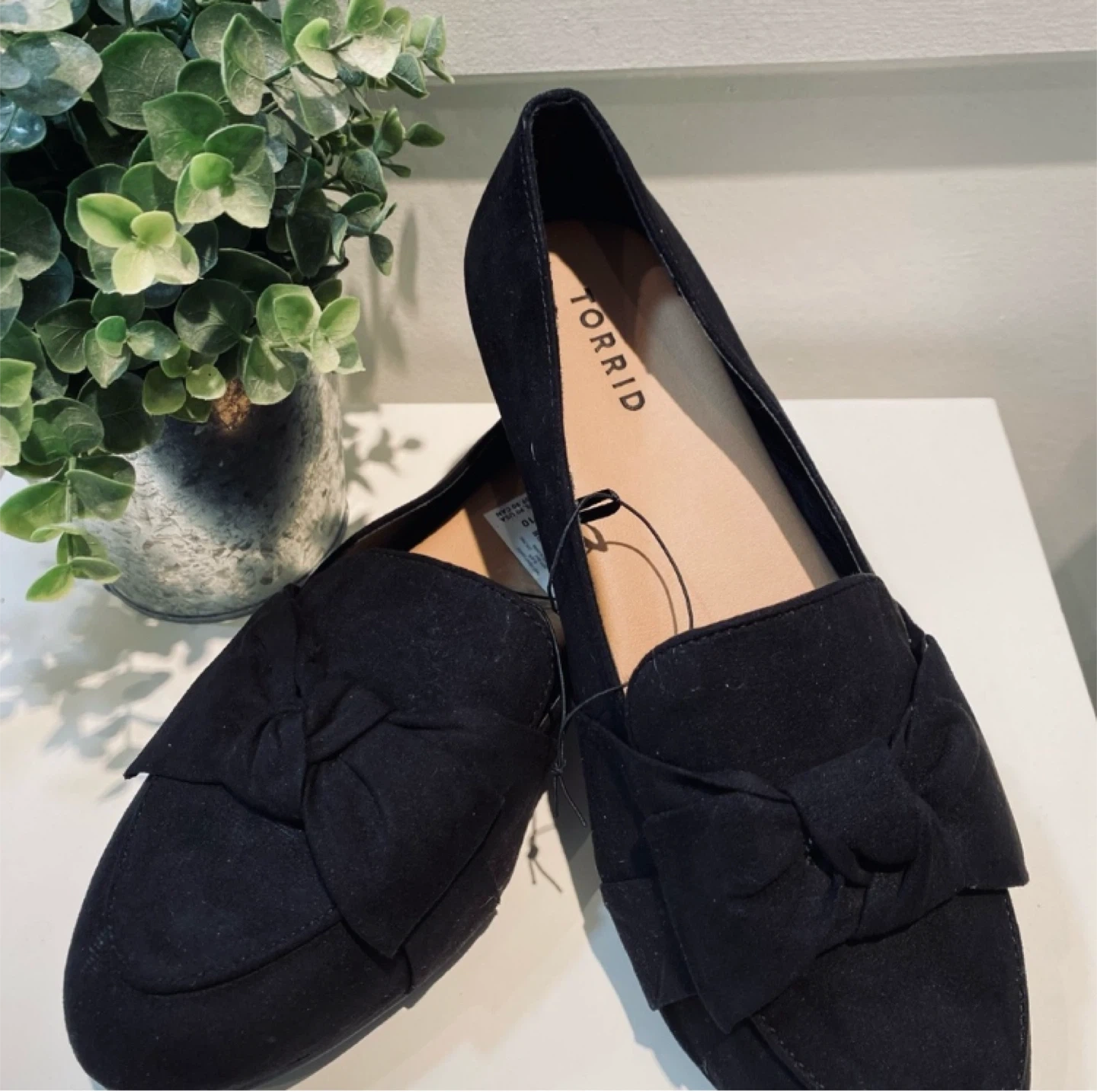 Cute velvet flats with bow detail. These shoes are brand new with the tags. They are super comfortable and versatile. Like all Torrid shoes these are wide width.