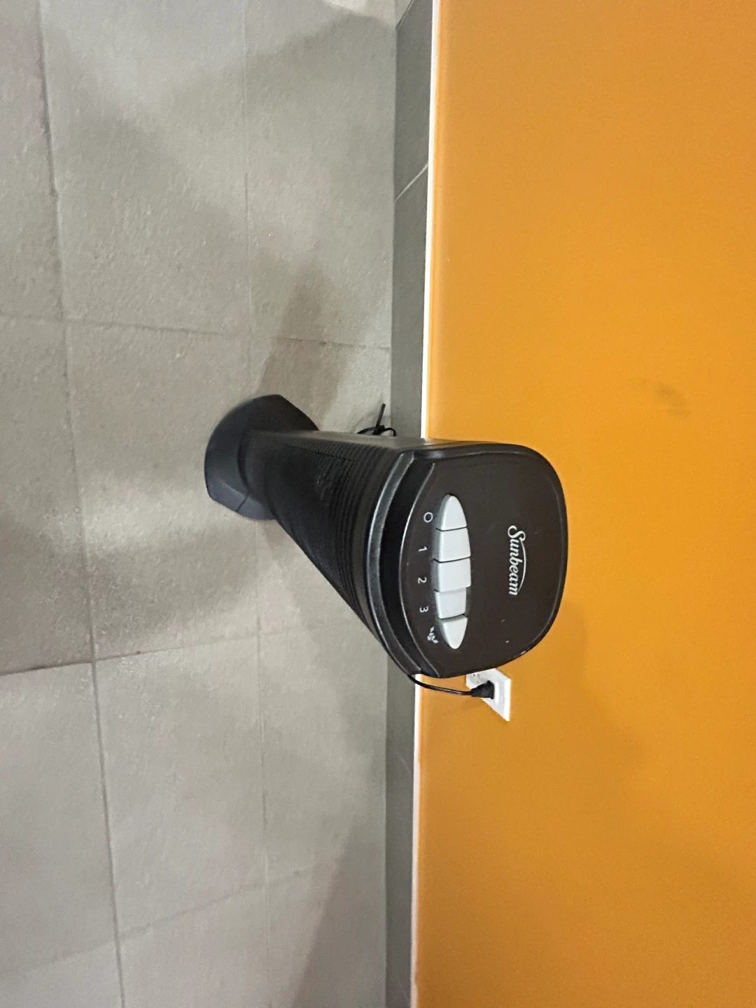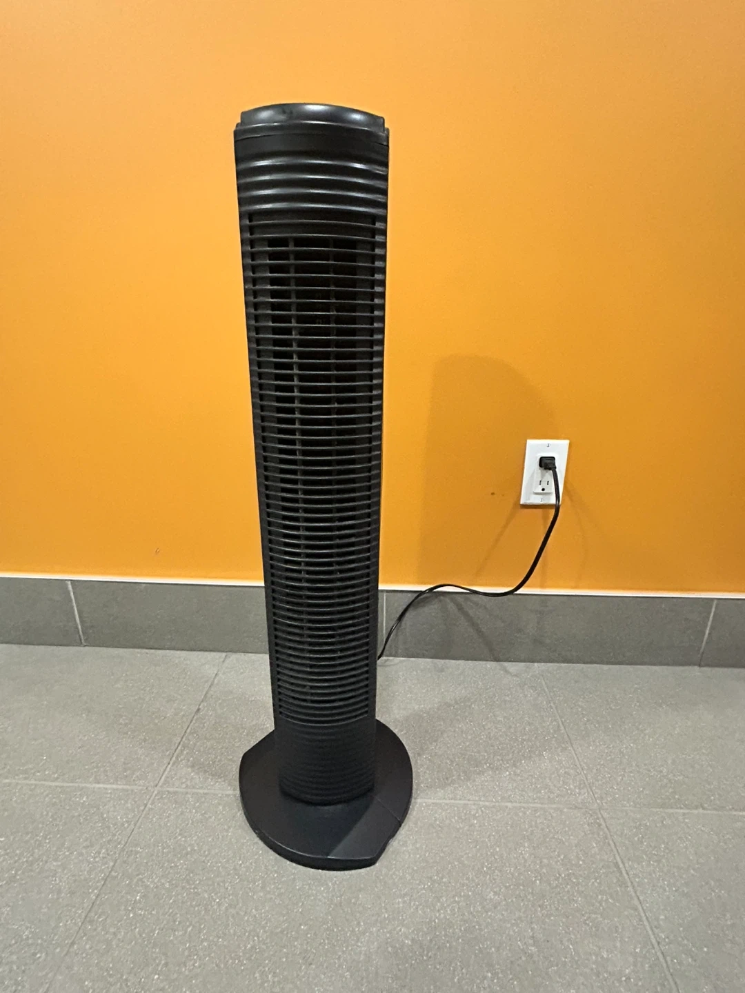 This Sunbeam tower fan is black and has three speed settings. It's a great way to keep your room cool. Plugs into a standard wall outlet.