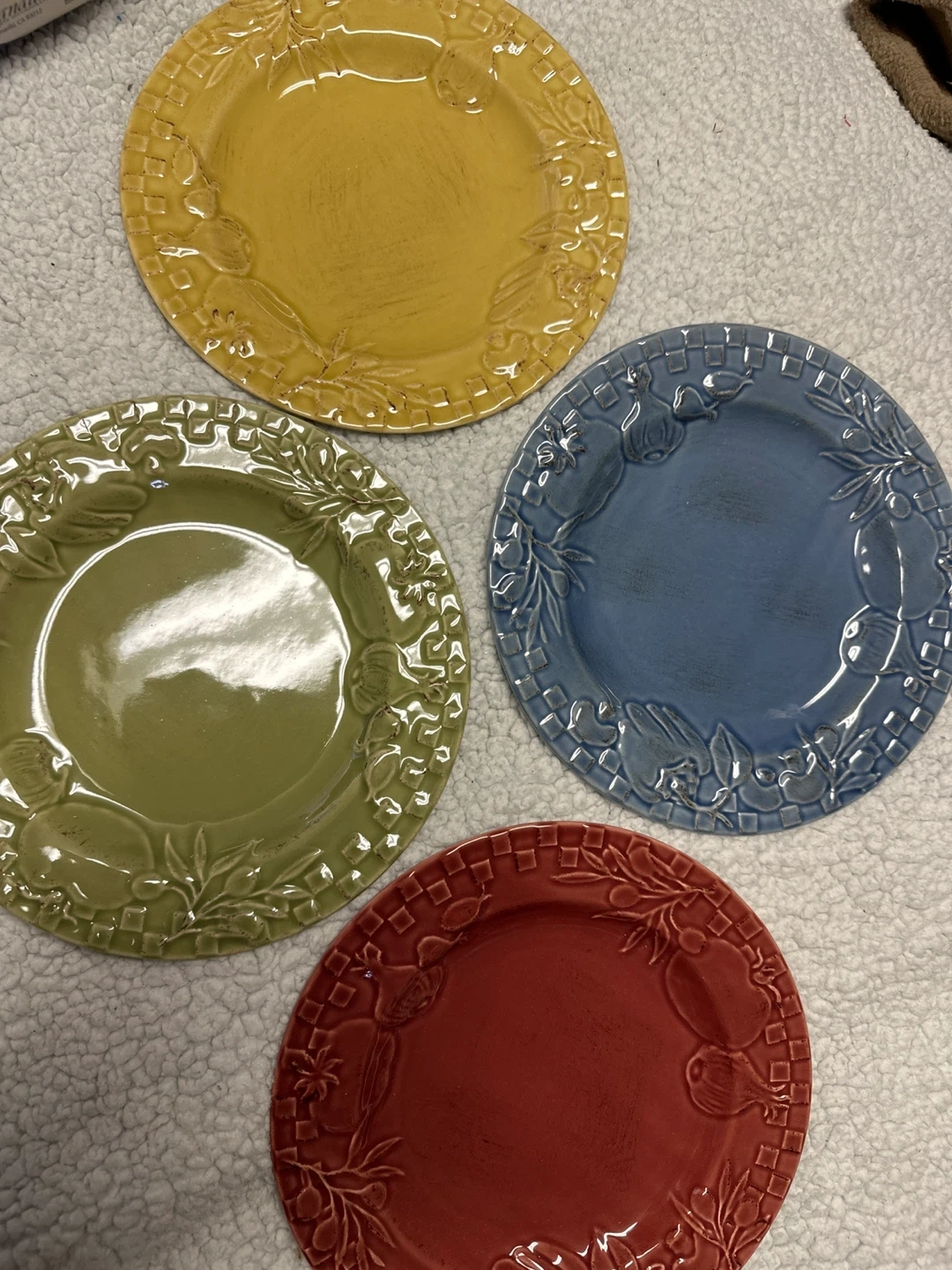 This set includes four 8 1/4 inch plates from Everware's Home Grown collection. They're made of stoneware and are dishwasher and microwave safe. Plates are in assorted colours.