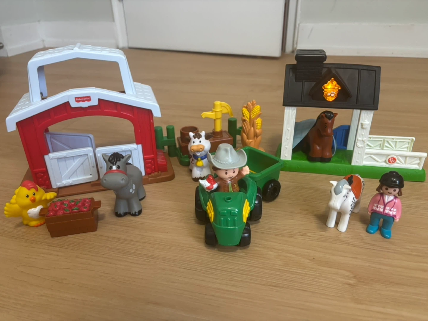 This Little People farm set includes a red barn, a stable (light and sound effects), a tractor with a trailer, and various animal figures like a horse, cow, chicken, and a farmer. It also comes with fencing and corn stalks and Playmobile figures of horse and girl. This playset offers hours of imaginative fun for little ones on the farm! Great condition.