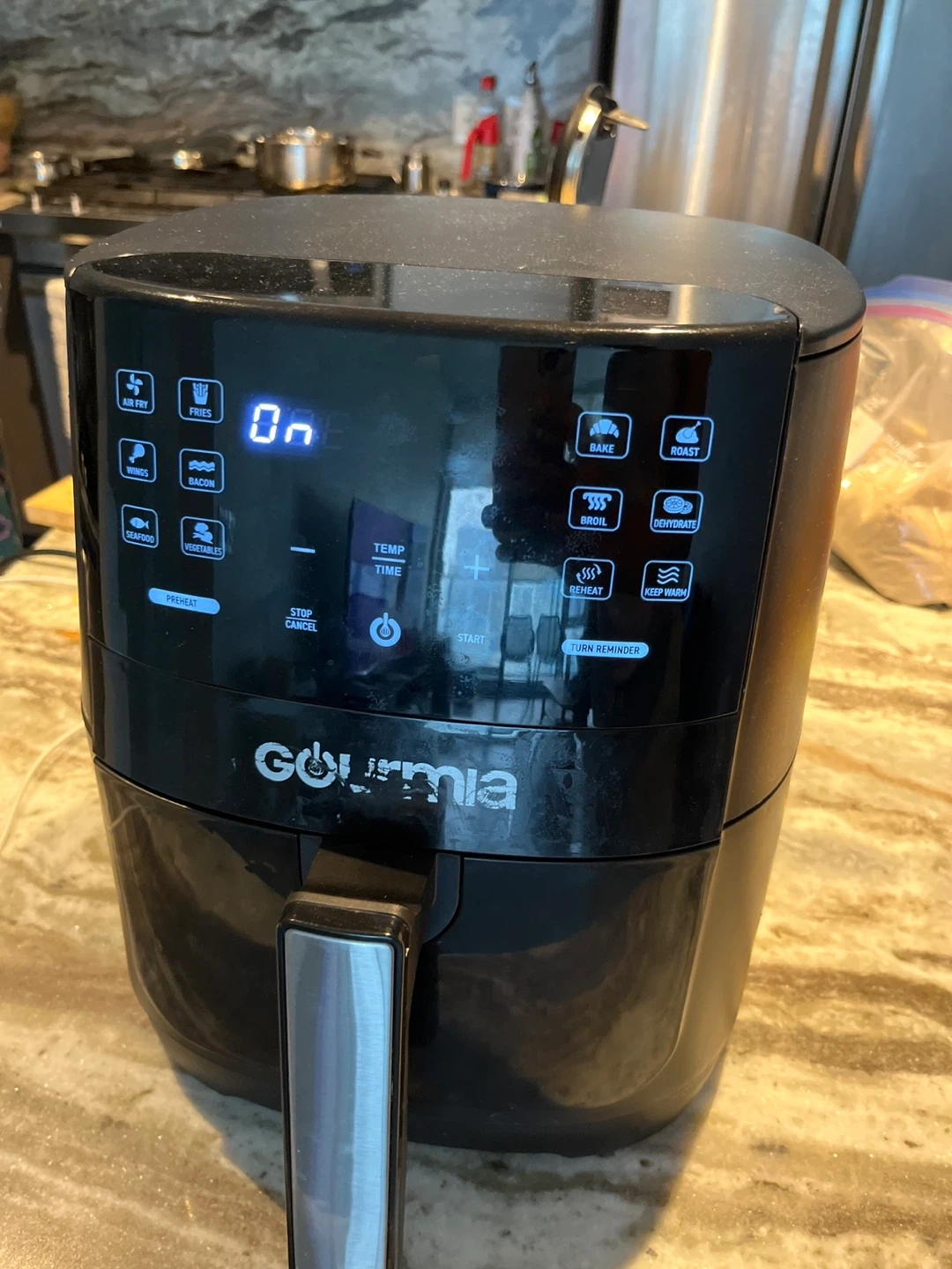 This is a Gourmia air fryer. It has multiple cooking presets including Air Fry, Fries, Wings, Bacon, Seafood, Vegetables, Bake, Roast, Broil, Dehydrate, Reheat, and Keep Warm. The unit has a digital display for temperature and time settings.