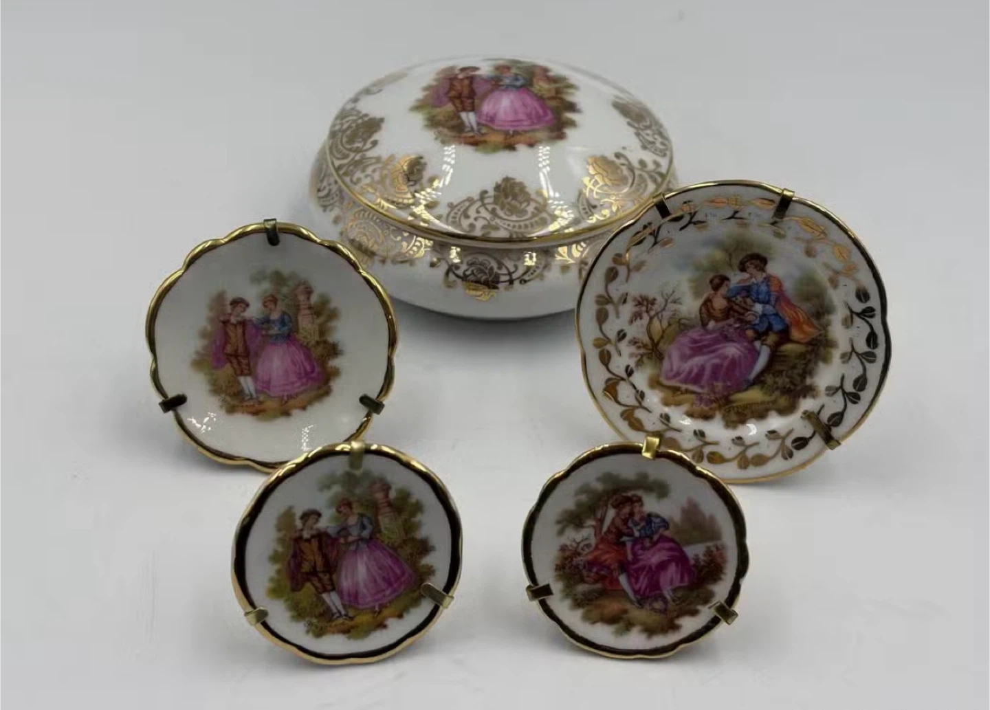 Selling a set of Fragonard Limoges France trinket dishes and a matching box. They feature intricate designs and a gold trim, adding a touch of elegance to any space. The dishes and box are in great condition and ready to be displayed or used for storing small treasures