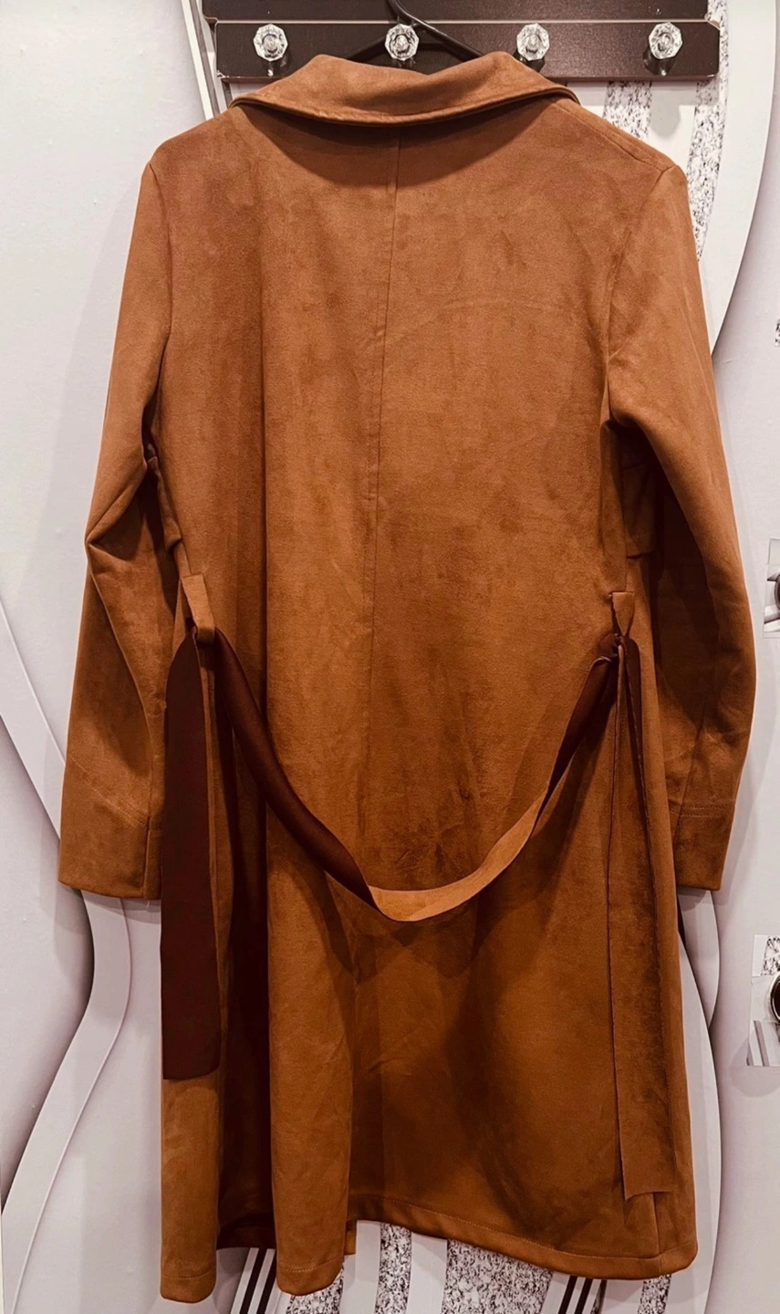 Long brown suede trench coat with a belt. Features two large black eyelets on the front and double Breasted Notched Lapel Winter Long Trench Coat.