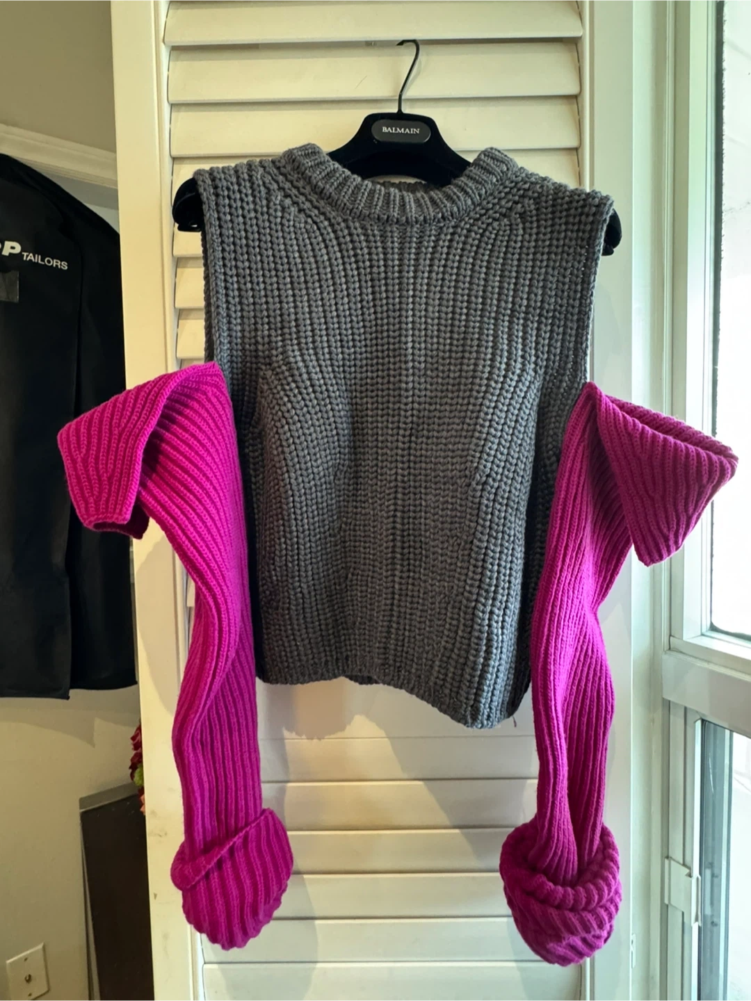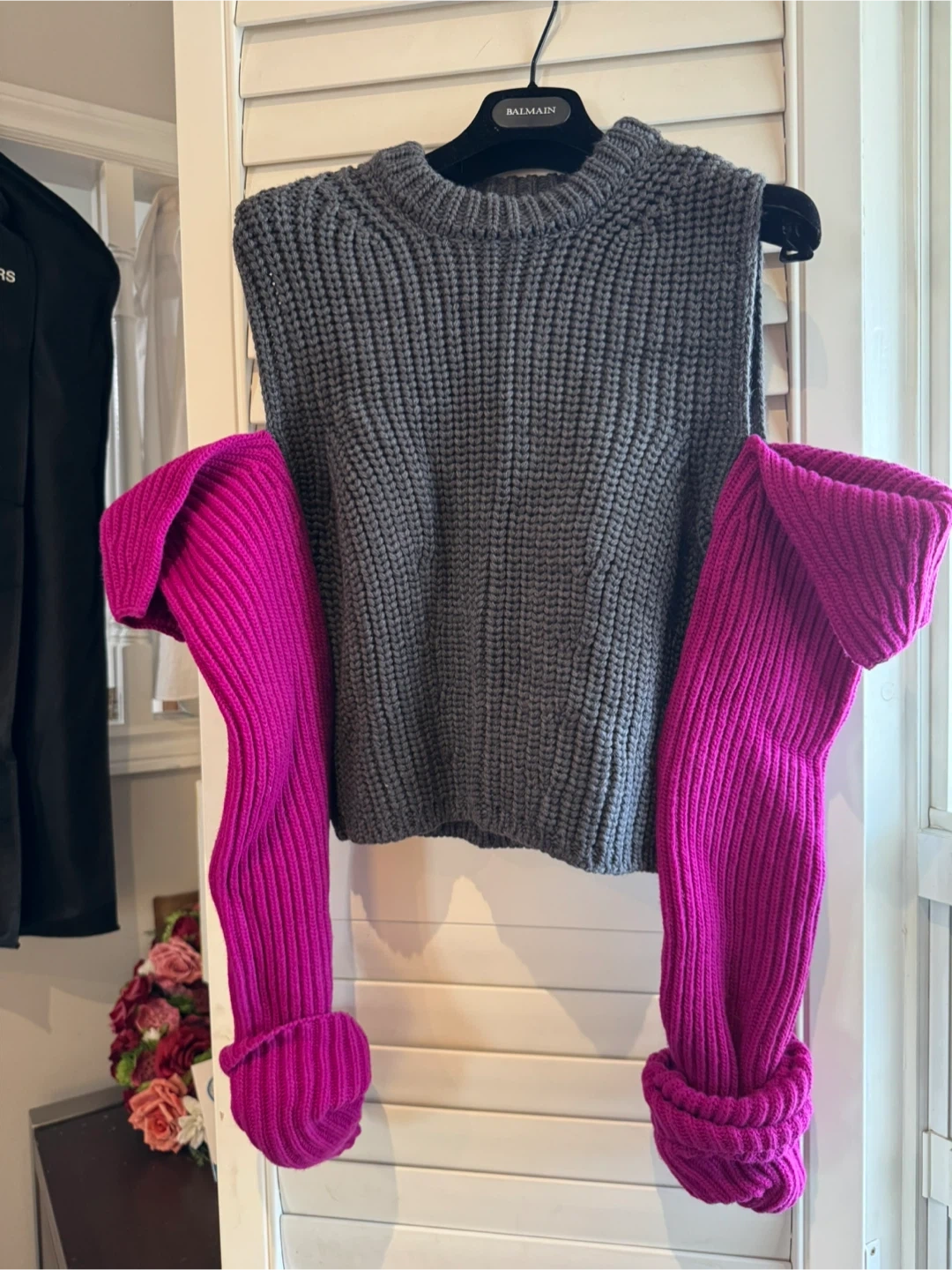 Selling a unique Calvin Klein knit vest! It features a stylish grey knit body and eye-catching detachable pink sleeves. Perfect for adding a pop of colour to your wardrobe and staying cozy.