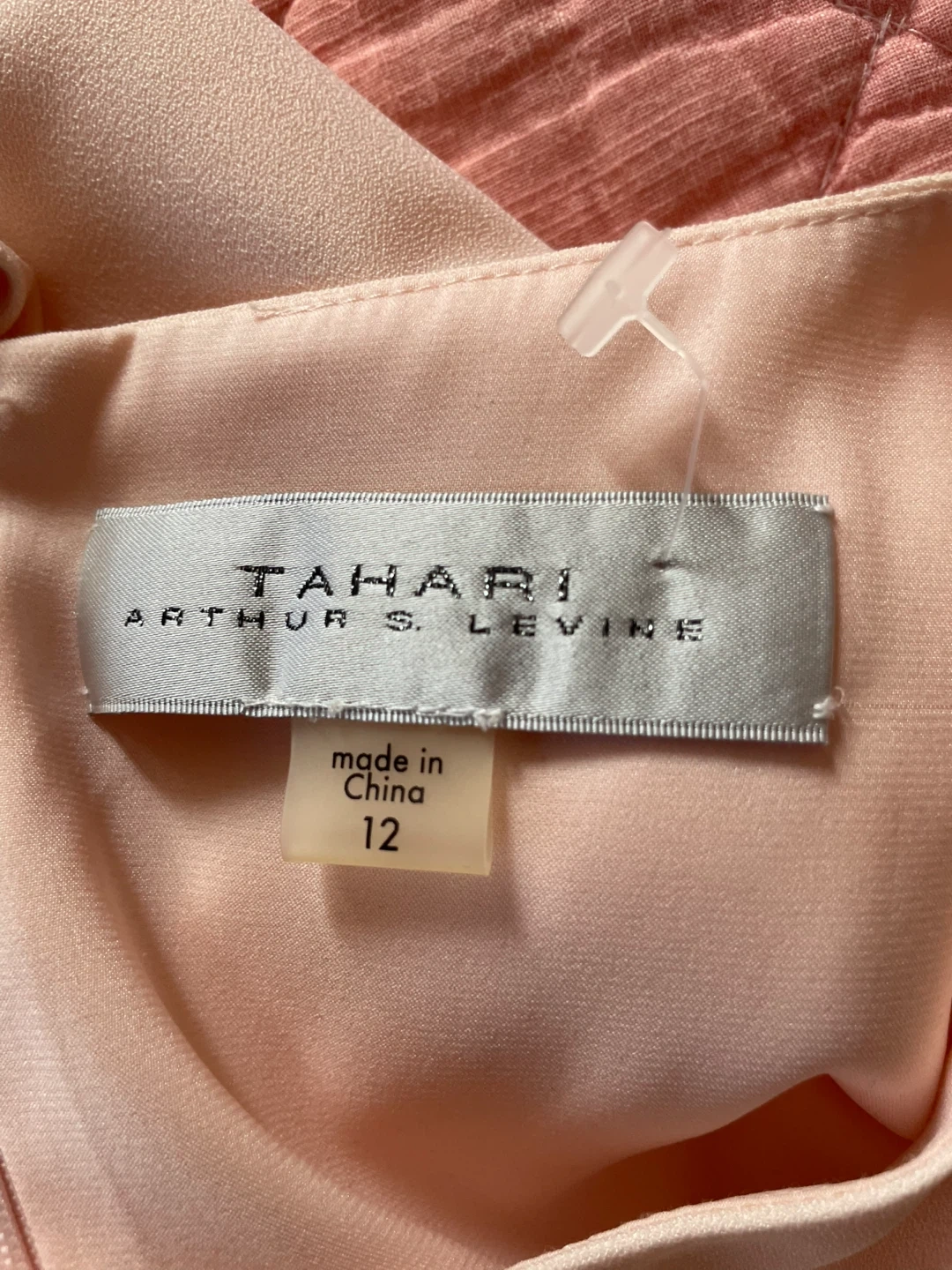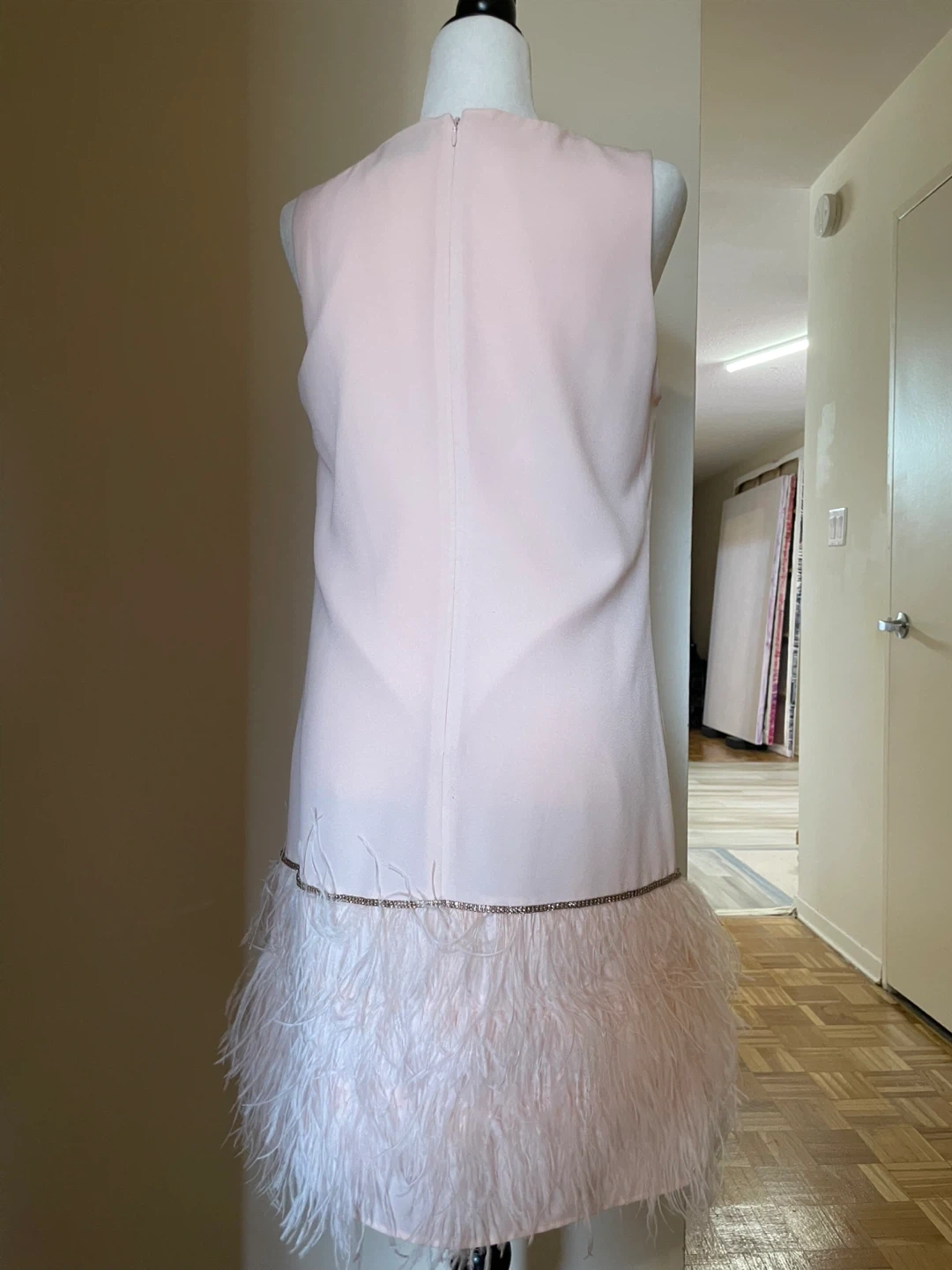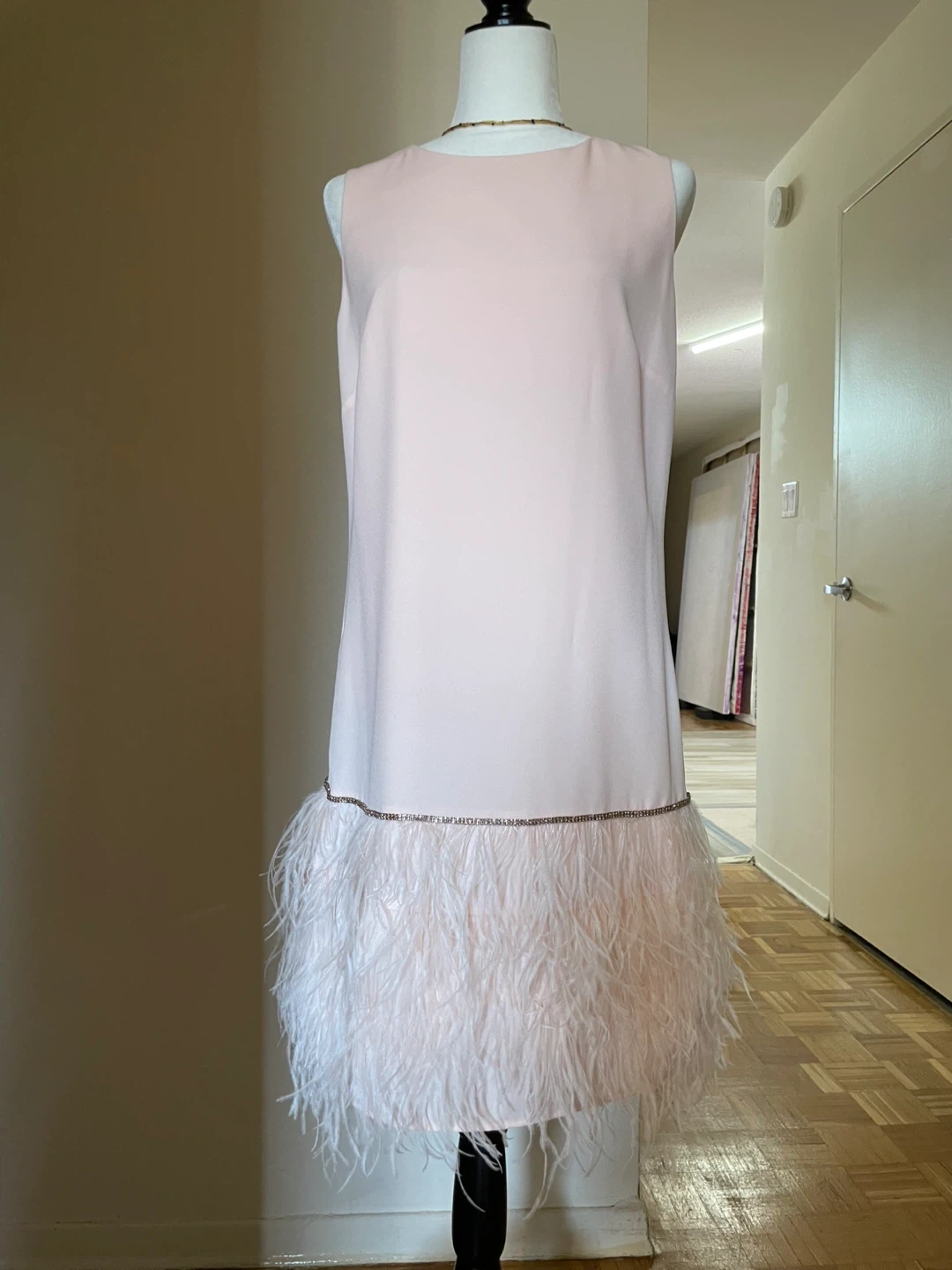 Pretty pink sleeveless dress by Tahari Features a beautiful feather trim hem with delicate beading. Size 12 I would say M .