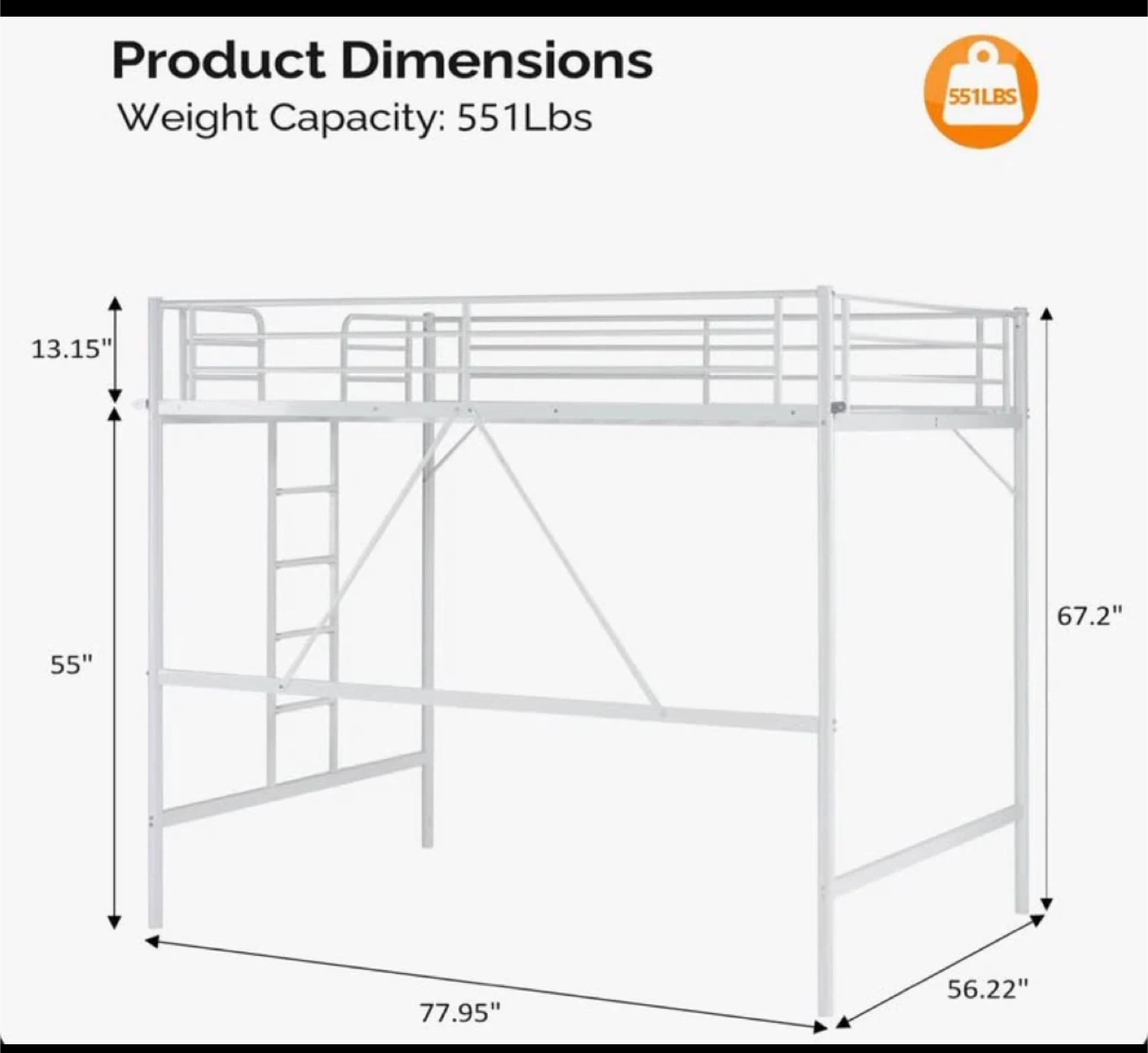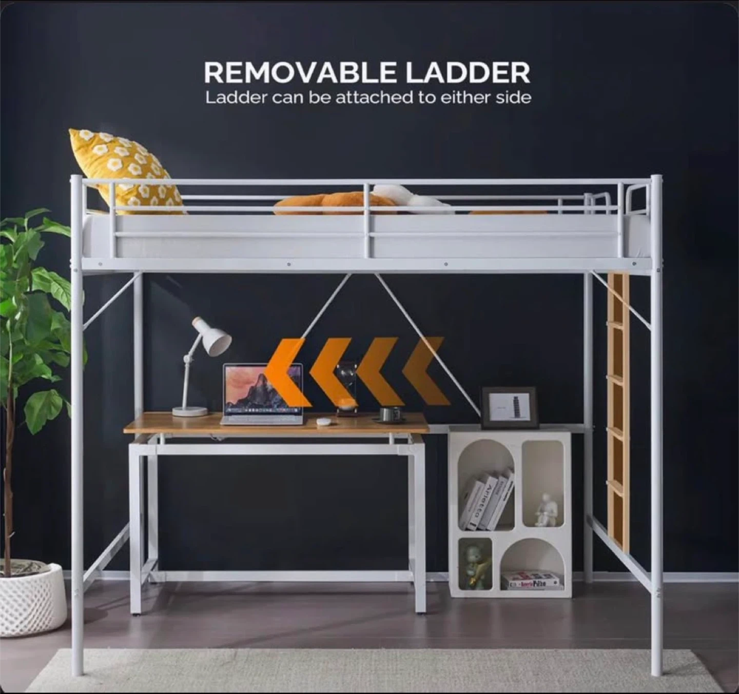 This white metal loft bed is perfect for saving space. It's designed for adults, kids, and teens and includes an interchangeable ladder. The ladder can be attached to either side for flexibility.