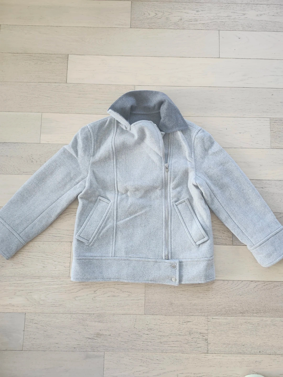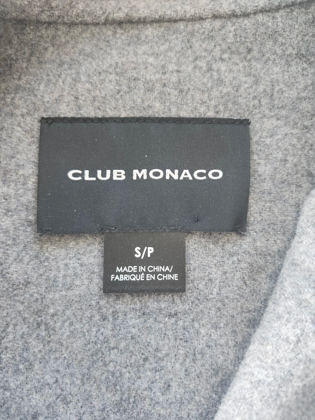 A stylish Club Monaco jacket in a light grey colour. It's a size S/P with a zippered front and a collared neckline. Made in China.