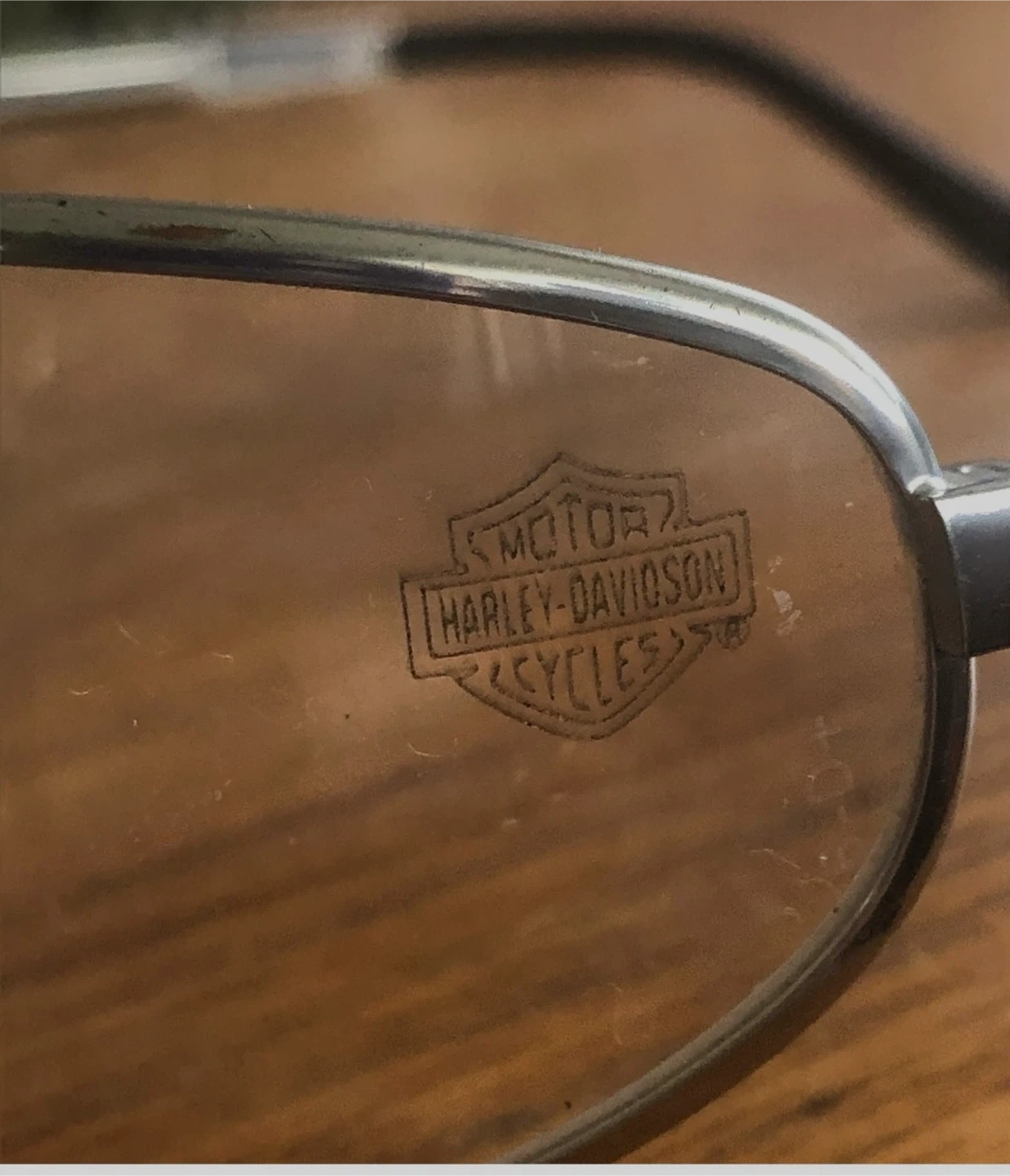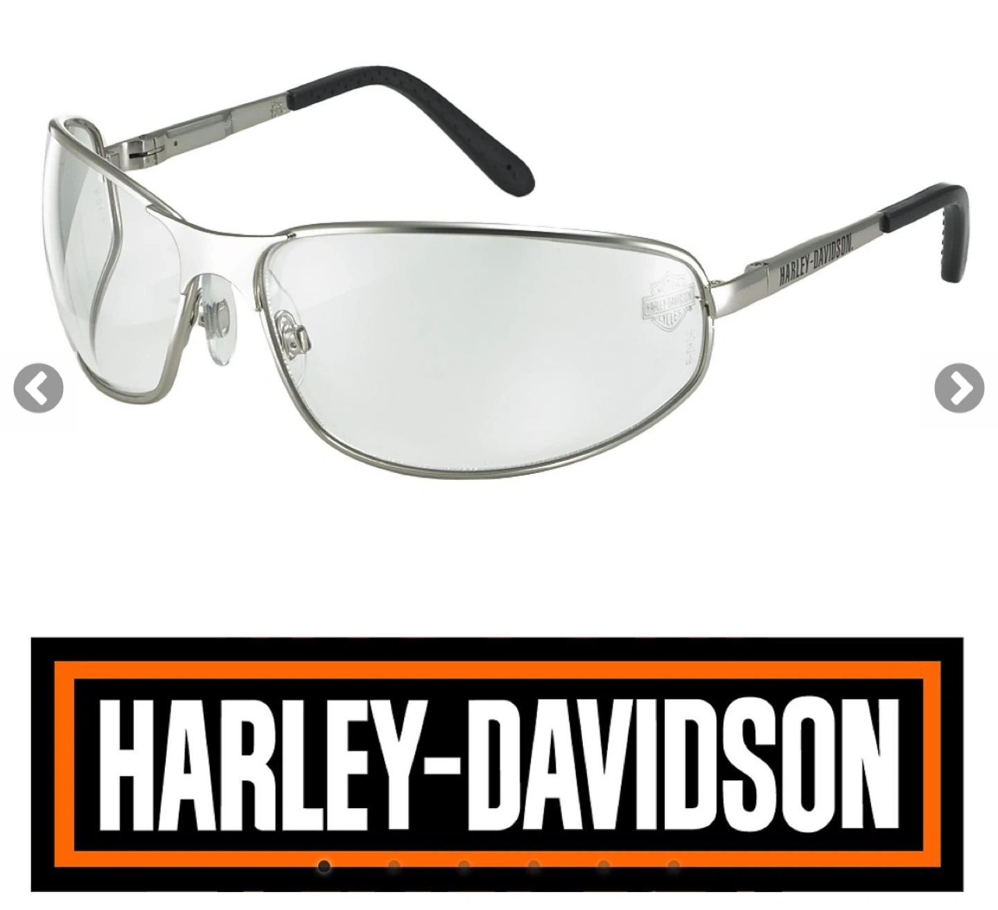 Harley-Davidson safety glasses with clear lenses. They feature a silver-toned metal frame with black ear tips. Suitable for riding or workshop use.