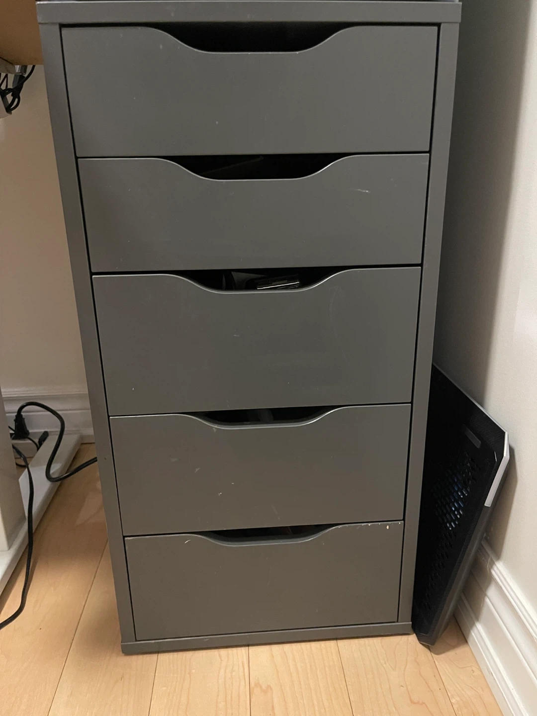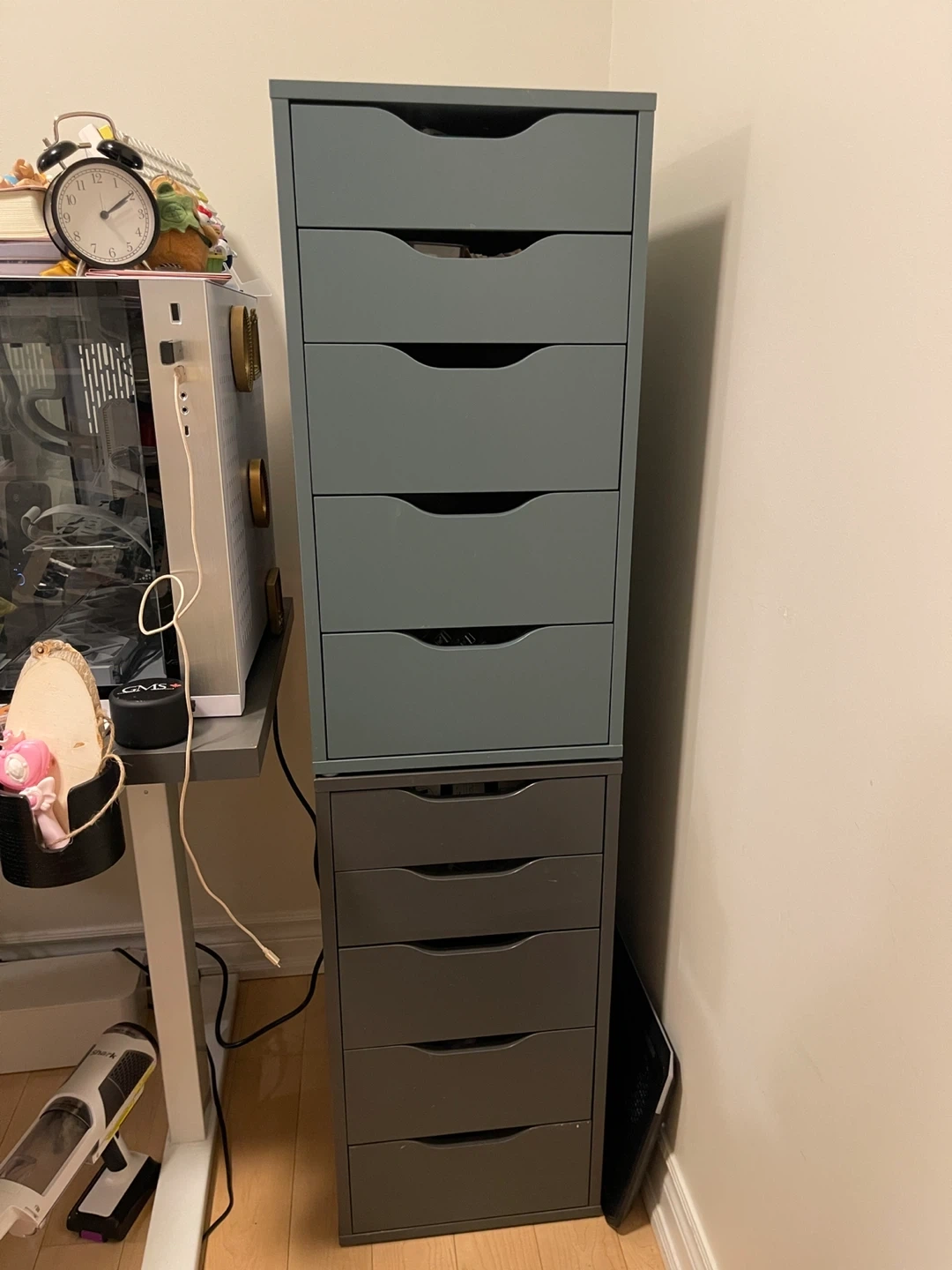 Selling both used IKEA Alex 5 drawer unit in grey + grey-turquoise. Has some few scuffs on top from wear and tear. Grey-turquoise has some hole you can screw to a desk.