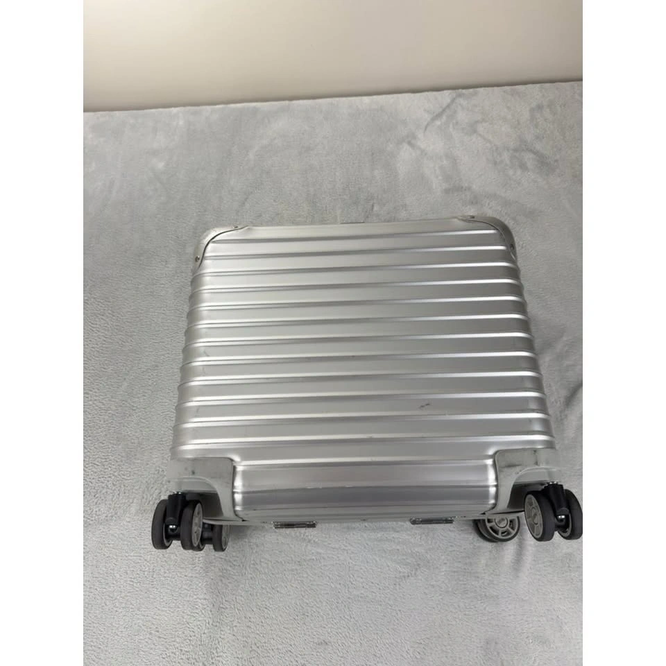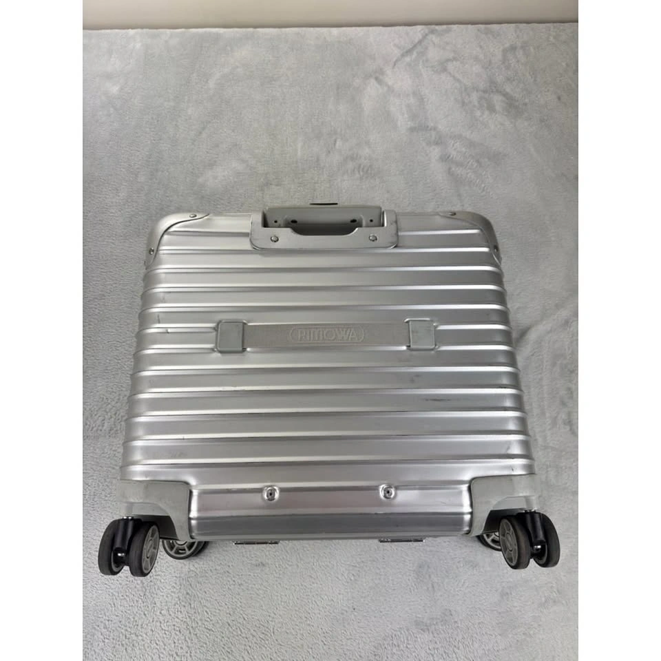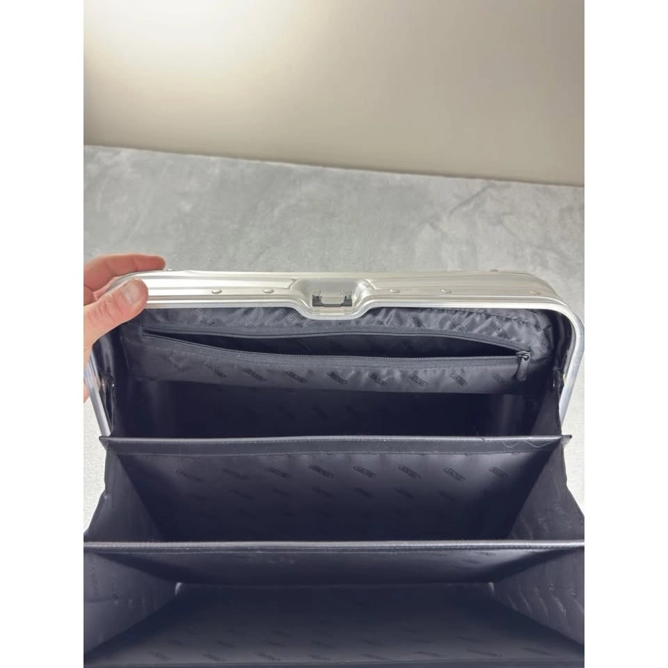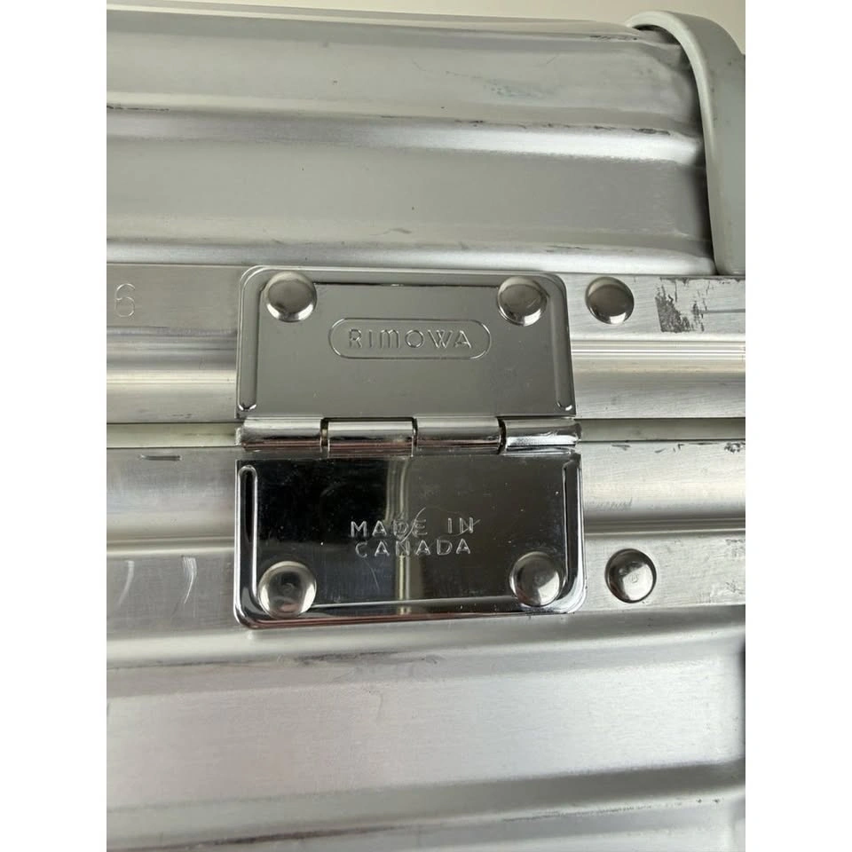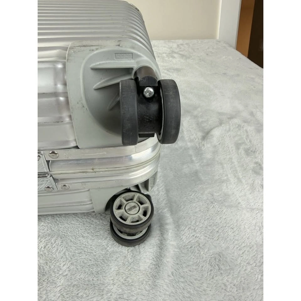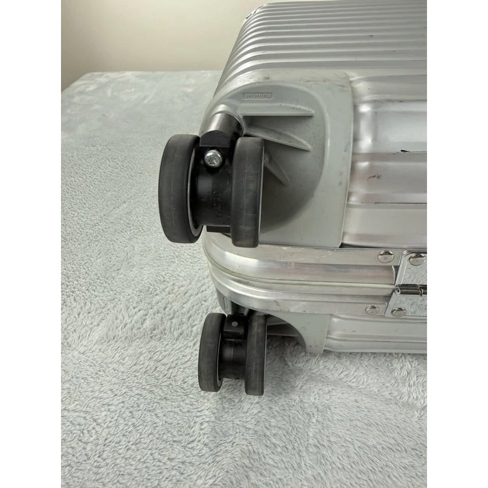 Rimowa Topas Aluminum Business Wheels Carry On in good pre-owned condition, as shown in the photos. Normal wear and tear is visible around the carry-on. Includes original manual and product details. Style number: topas business carry on. 100% aluminum. Made in Canada. Silver color. Measurements: 13" height, 16" width, 25.5" carry-on handle. See pictures for reference.