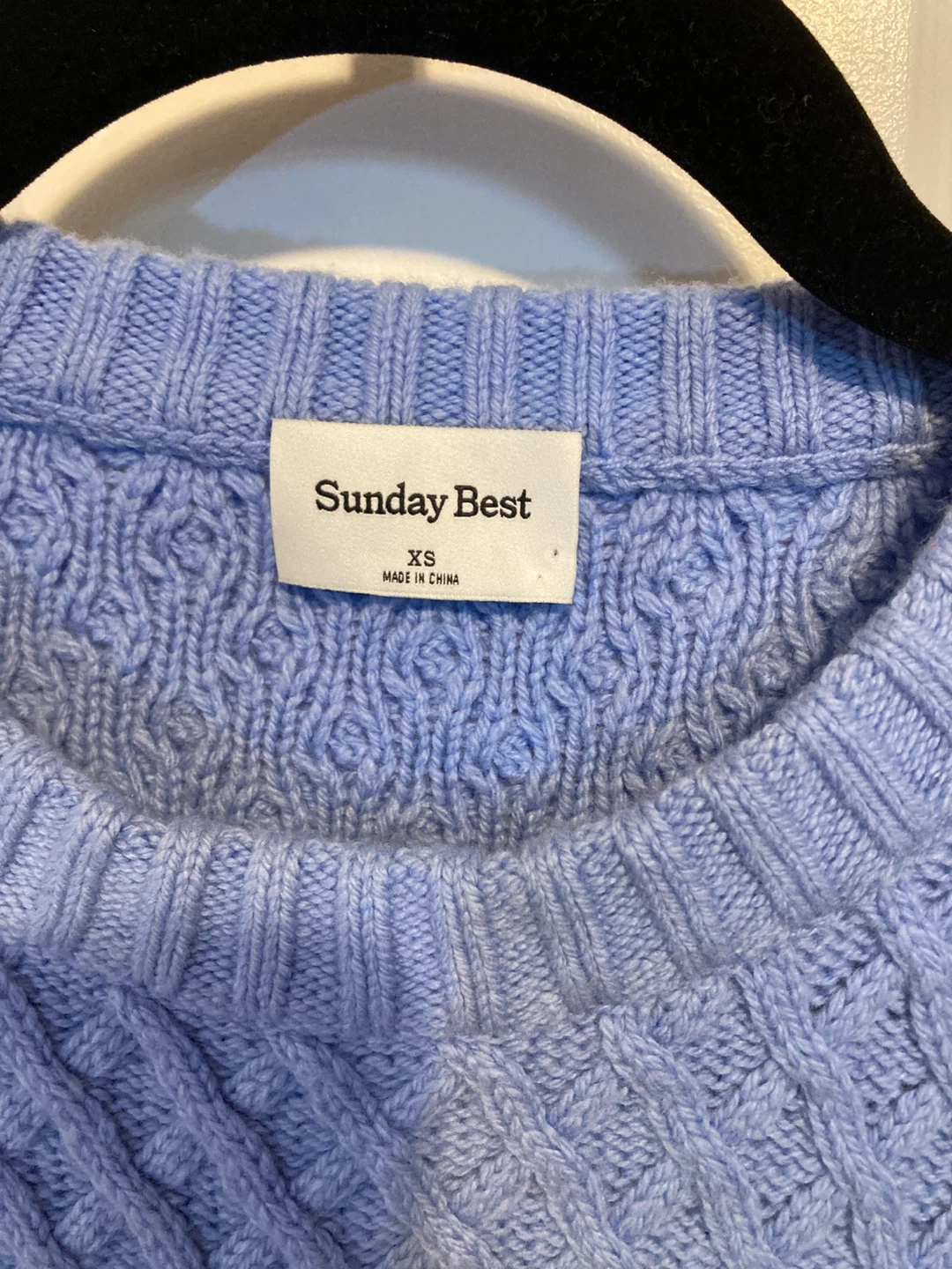 Sunday Best crewneck sweater with a cable knit design. It's a periwinkle colour. Made in China. This sweater would be nice for cooler weather.