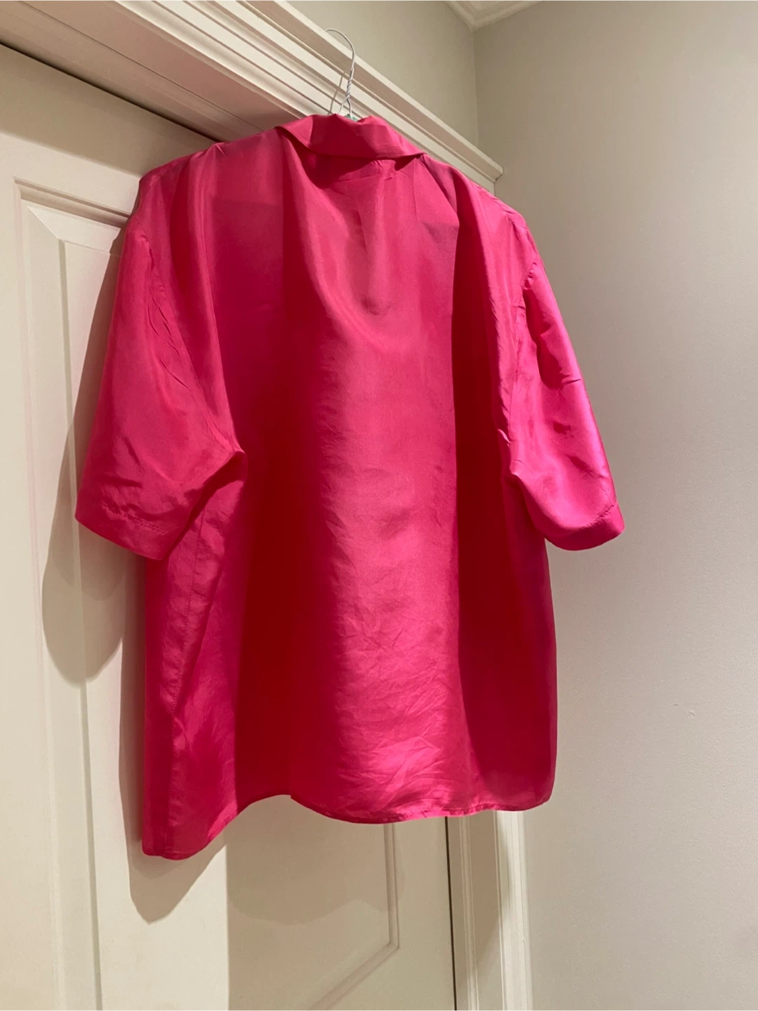 This is a 100% silk pink button-up blouse with short sleeves and a chest pocket. It's a loose-fitting style.
