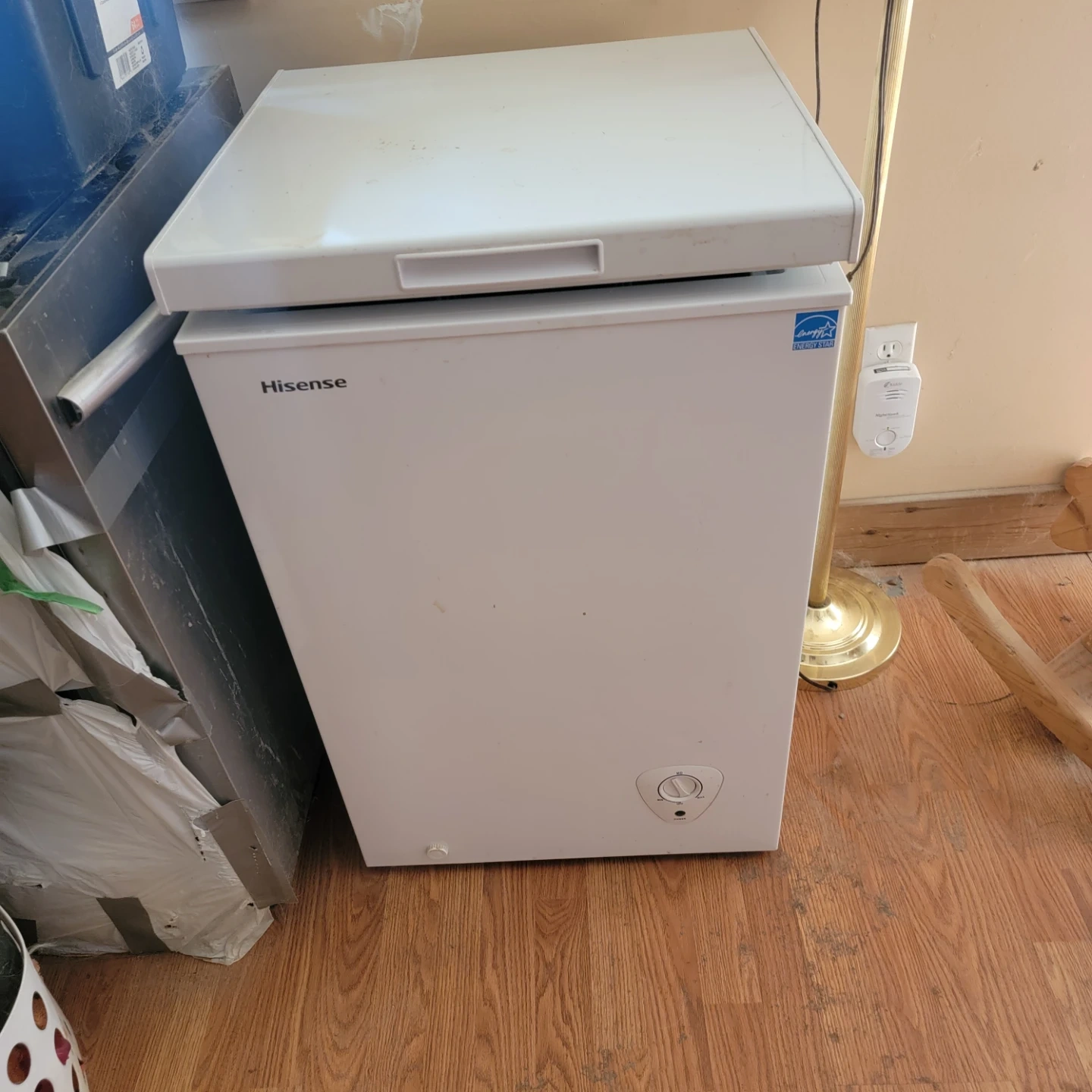 This is a white Hisense chest freezer. It has a compact size, perfect for extra freezer space. The temperature control knob is located on the front.