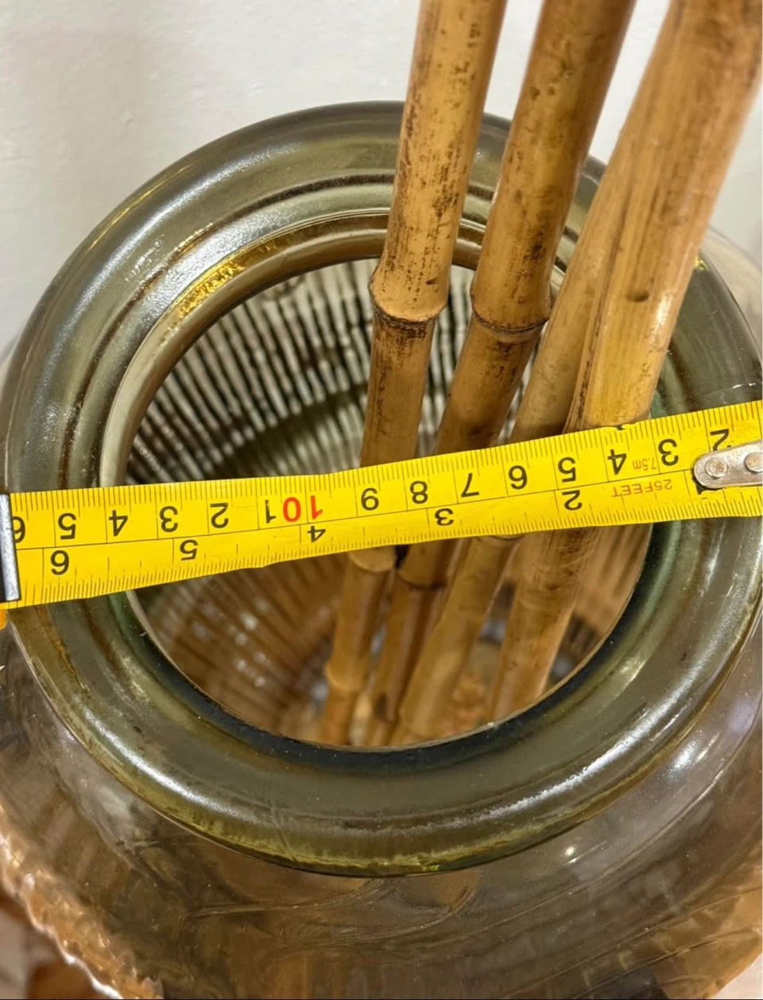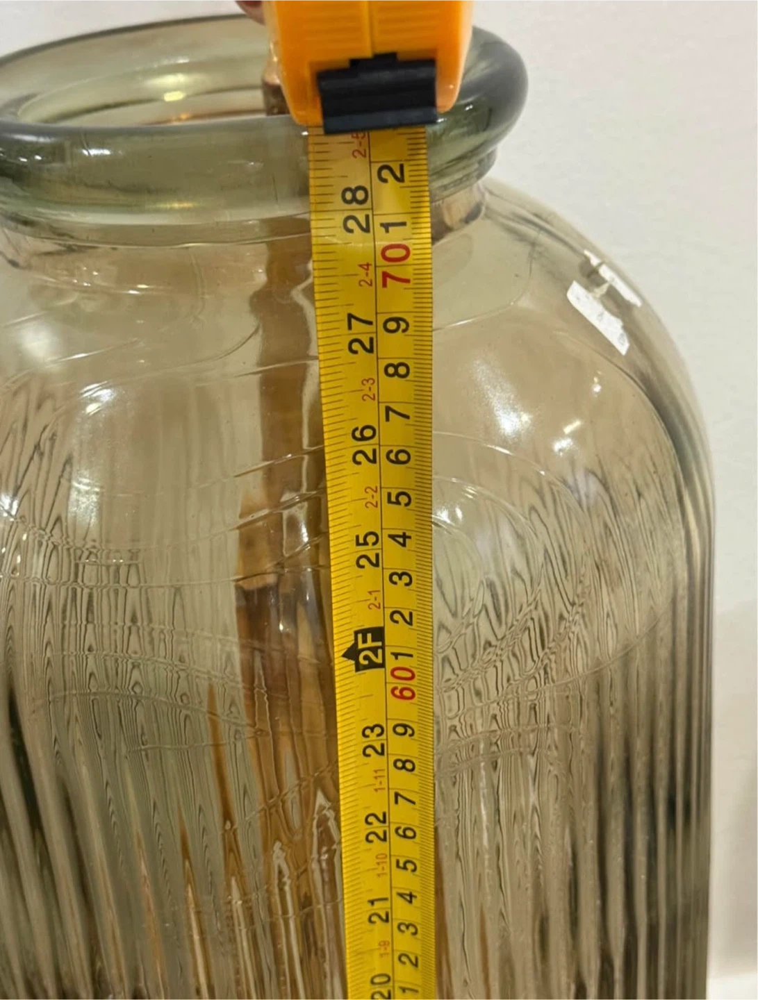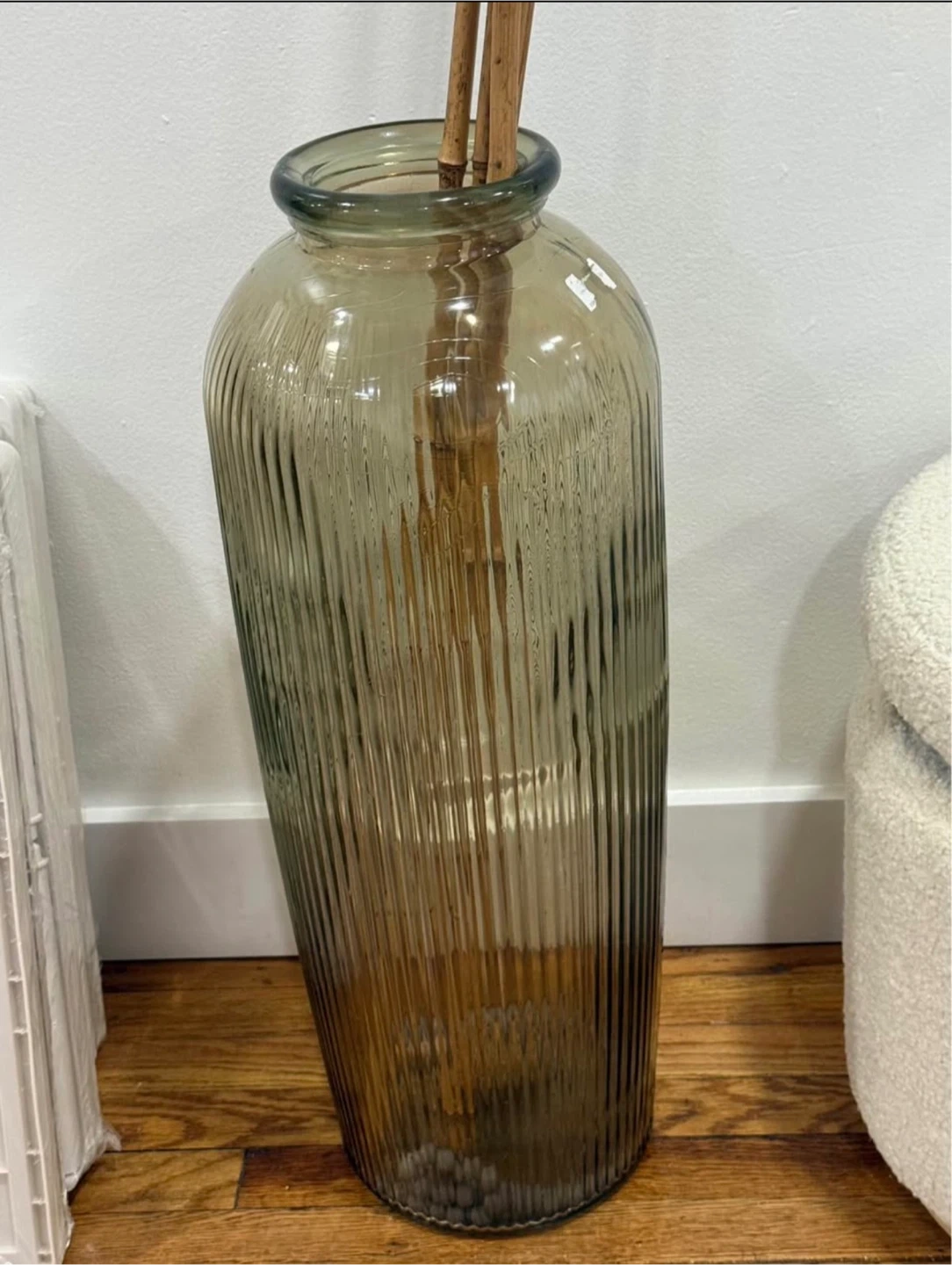 This tall, fluted glass vase has a smoky grey tint and measures approximately 28 inches high. The opening is about 6 inches in diameter. It comes with decorative wooden reeds inside. It's a beautiful piece for any room!