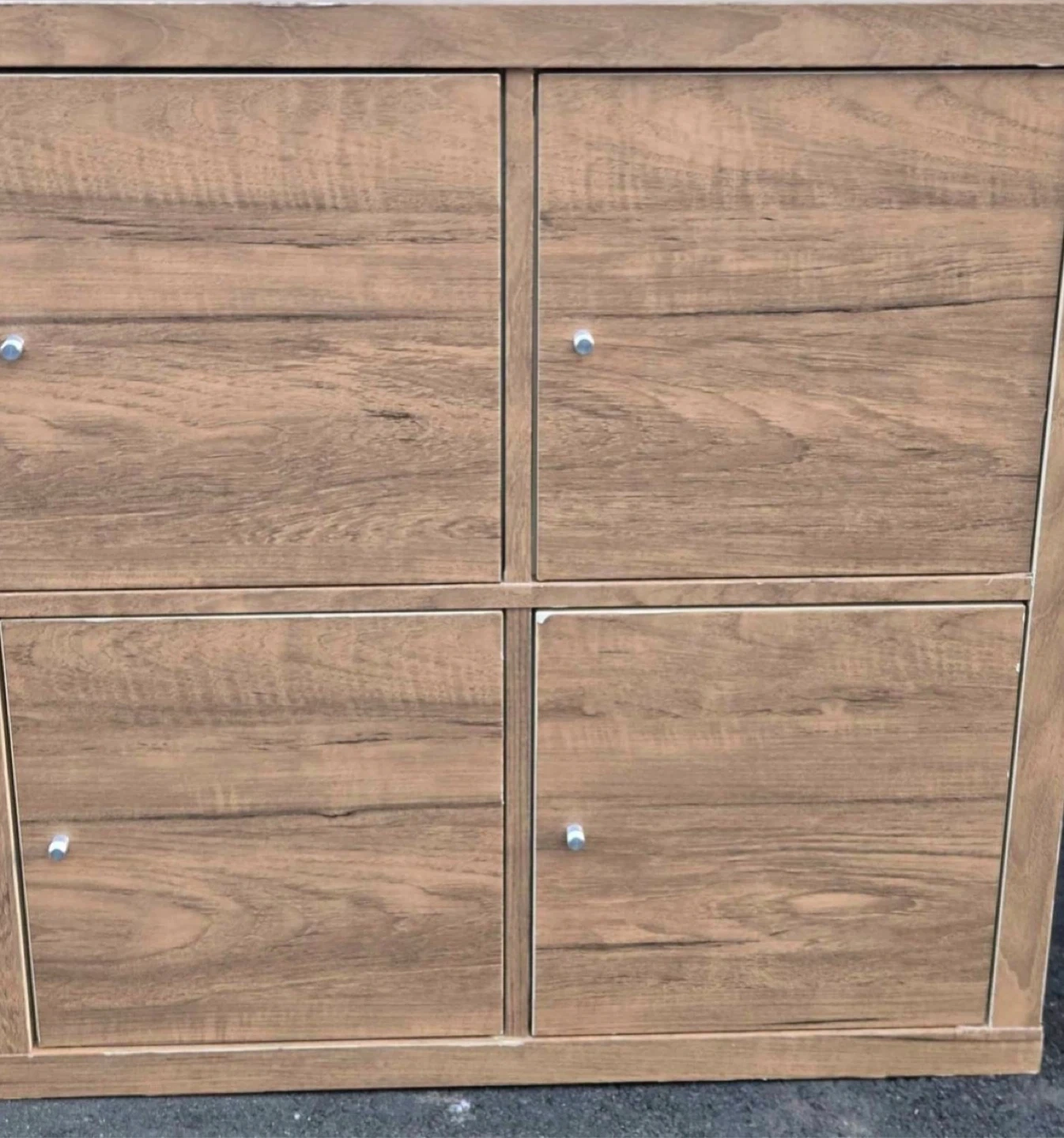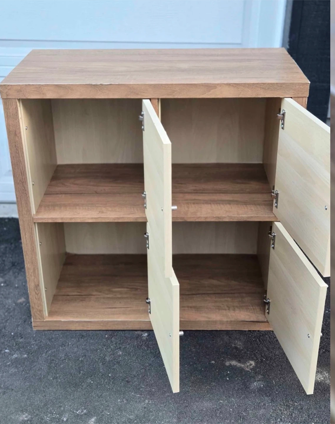 This is a compact wooden cabinet with four doors. It has two shelves inside for storage. Made from wood-like material.