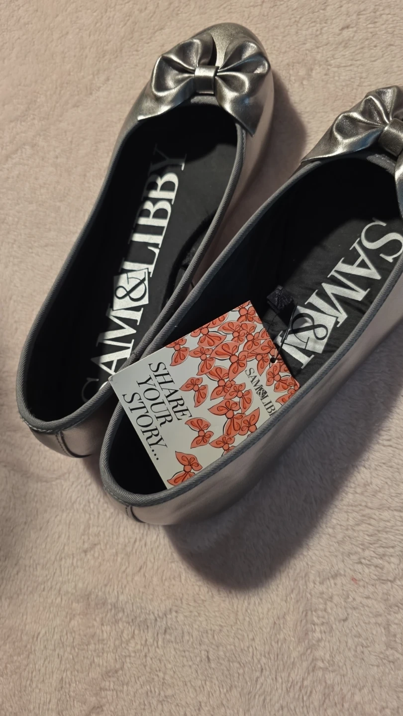 Silver ballet flats from Sam & Libby. These shoes feature a decorative bow on the toe. Very comfy and cushioned inner sole. Great for everyday wear!