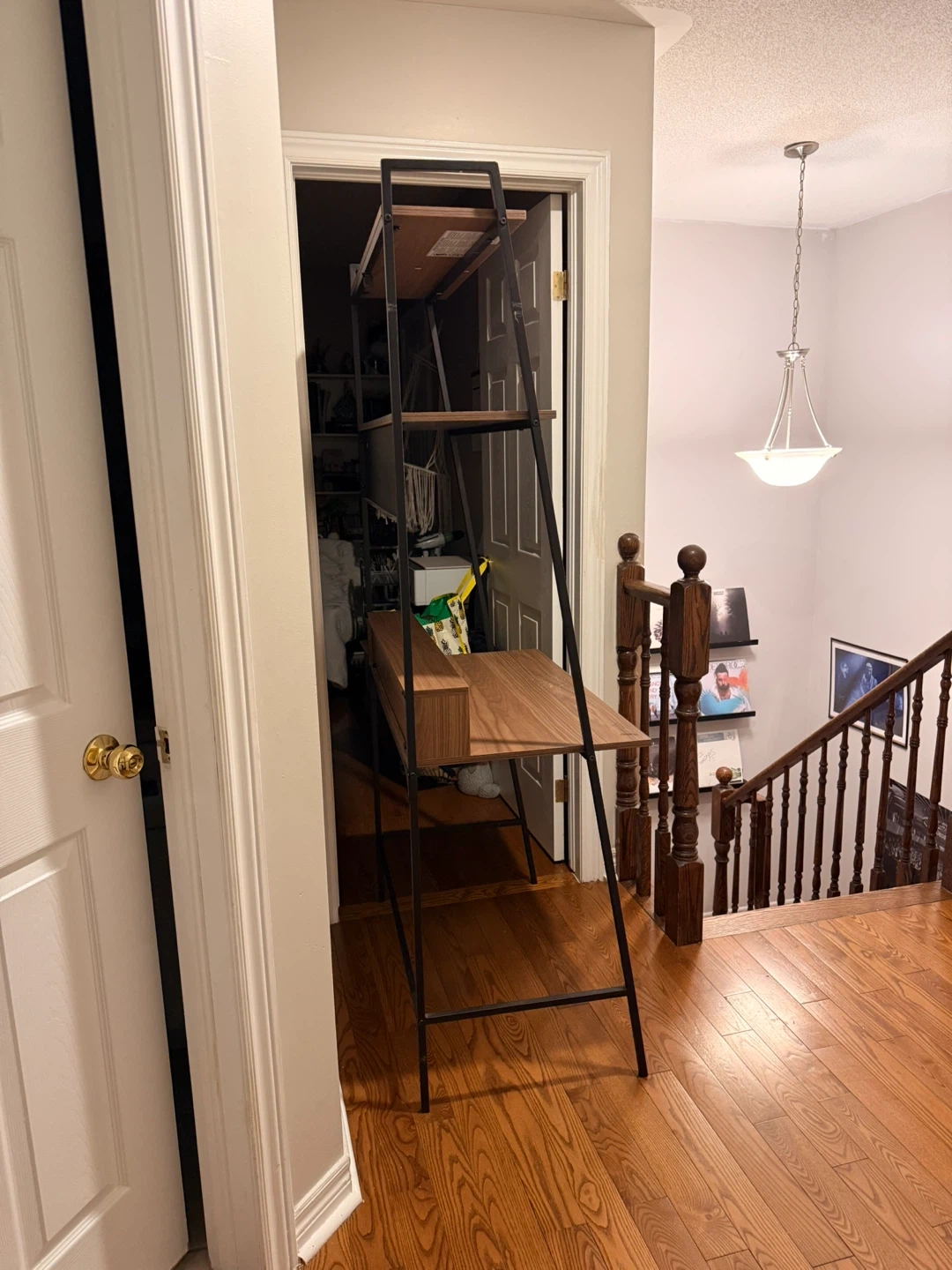 Selling a modern ladder desk with a wood finish and black metal frame. It's perfect for small spaces and adds a touch of style to any room. Great for a home office or study area!